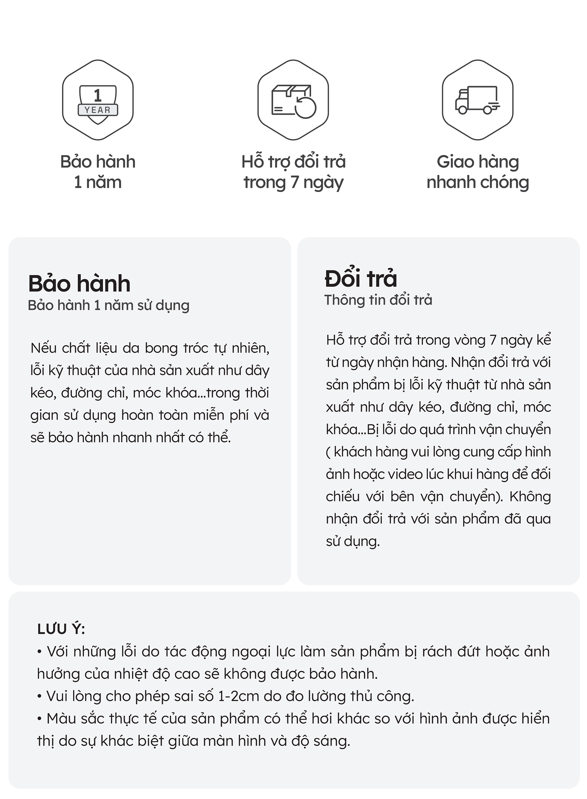 - Nhận đổi trả với sản phẩm bị lỗi kỹ thuật từ nhà sản xuất như dây kéo, đường chỉ, móc khóa…