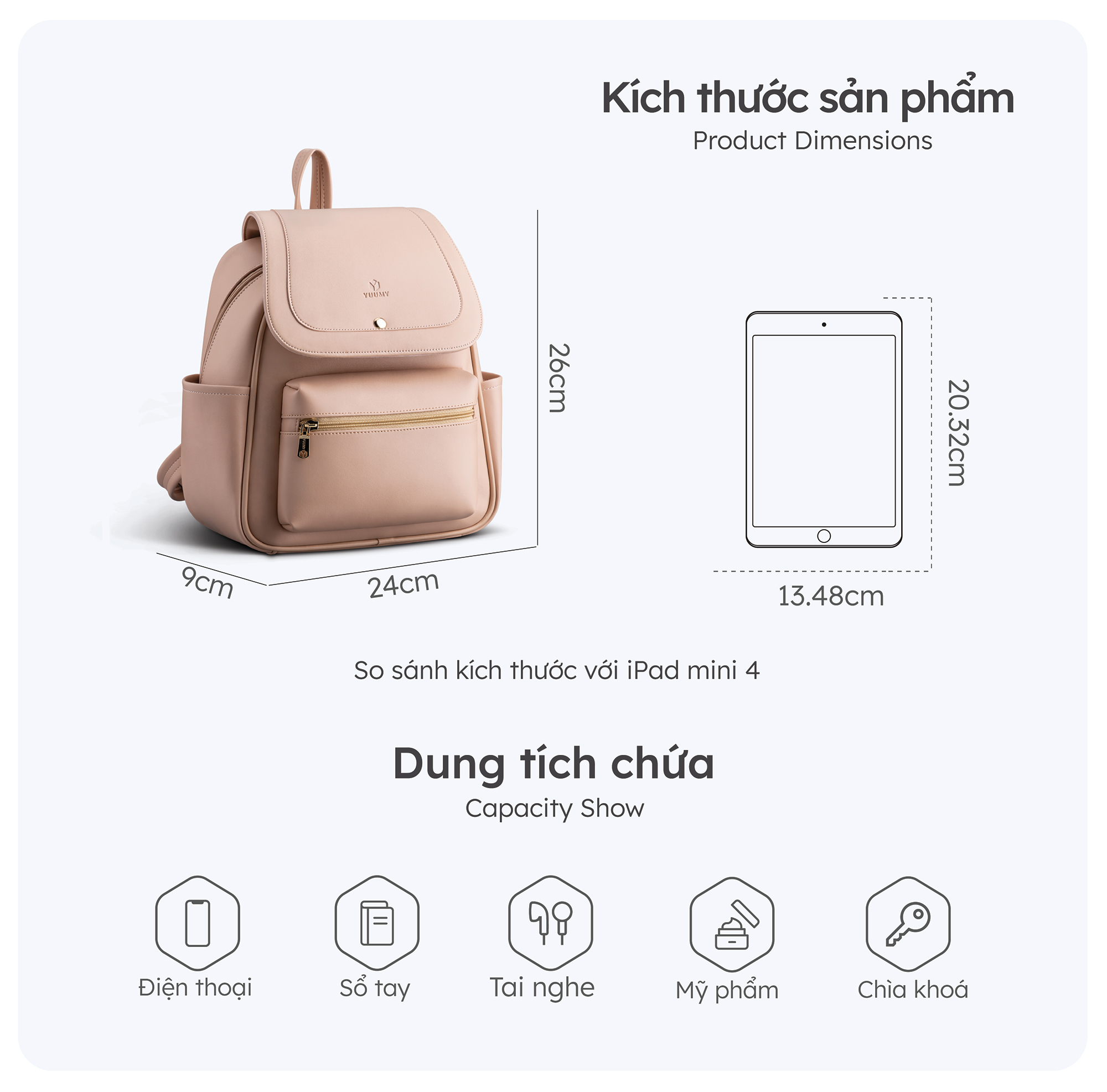 Kích thước | Dài miệng balo 19cm, Dài đáy balo 24cm, Rộng 9cm, Cao 26cm |