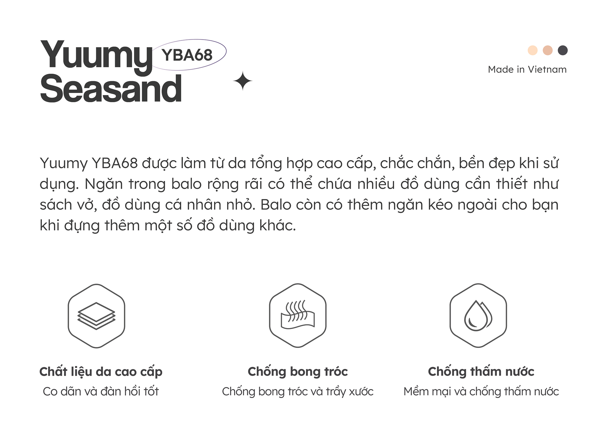 Balo da nữ nắp gập phối ngăn Yuumy Seasand YBA68 được làm từ da tổng hợp cao cấp, chắc chắn, bền đẹp khi sử dụng. Ngăn trong balo rộng rãi có thể chứa nhiều đồ dùng cần thiết như sách vở, đồ dùng cá nhân nhỏ. Balo còn có thêm ngăn kéo ngoài cho bạn khi đựng thêm một số đồ dùng khác. Sản phẩm dễ sử dụng cho những chuyến đi chơi, đi học, du lị