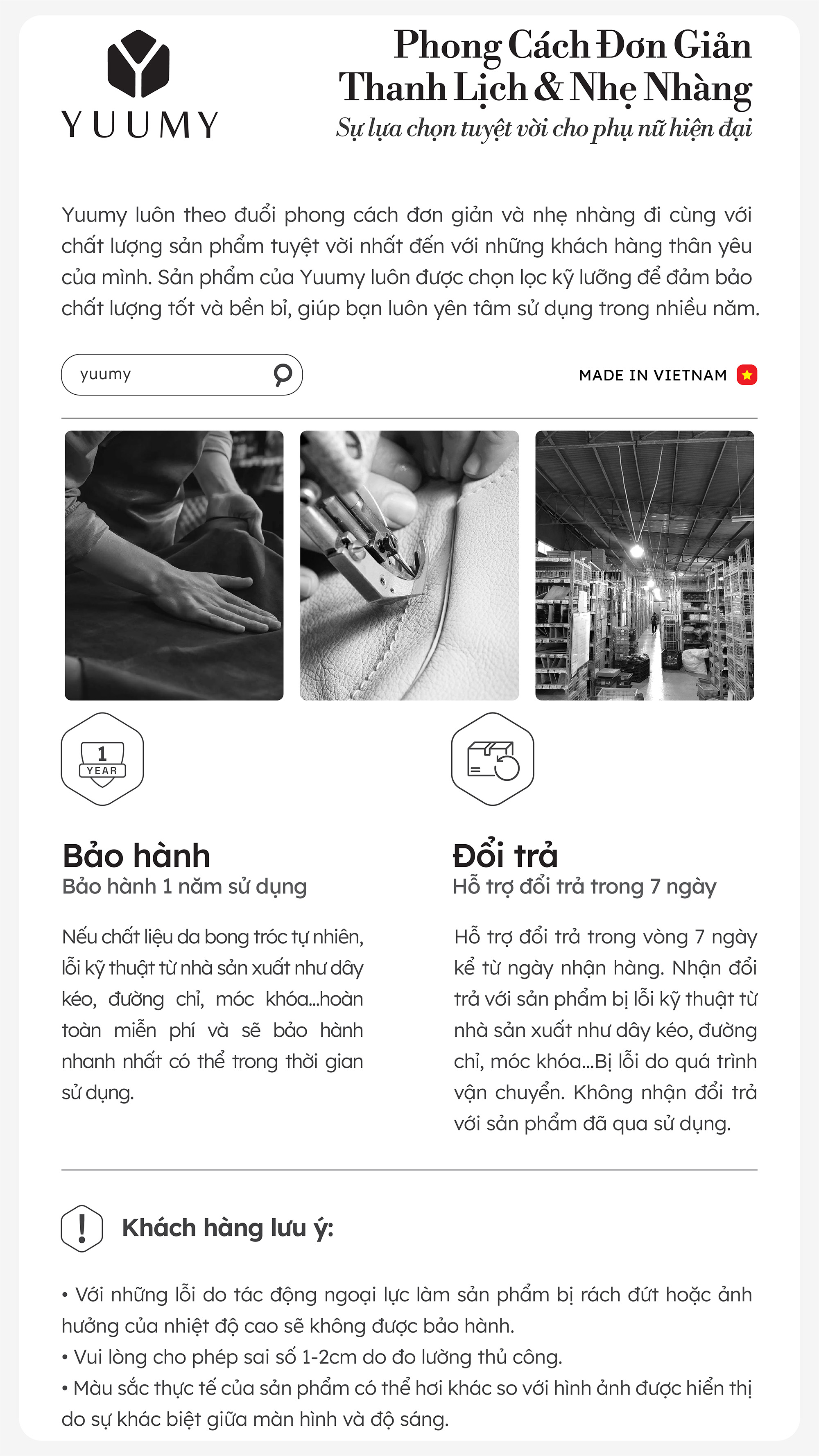 - Nhận đổi trả với sản phẩm bị lỗi kỹ thuật từ nhà sản xuất như dây kéo, đường chỉ, móc khóa…