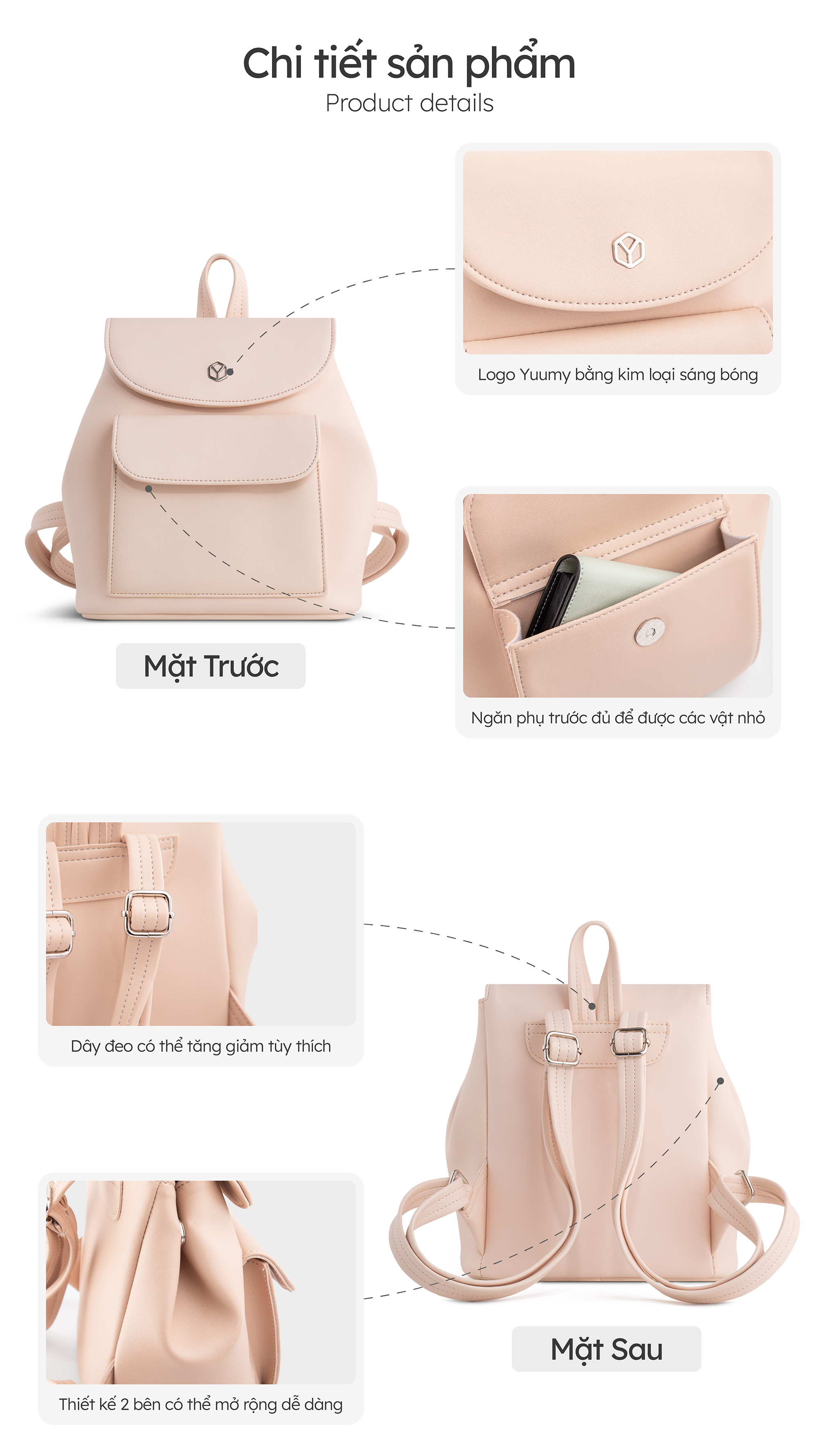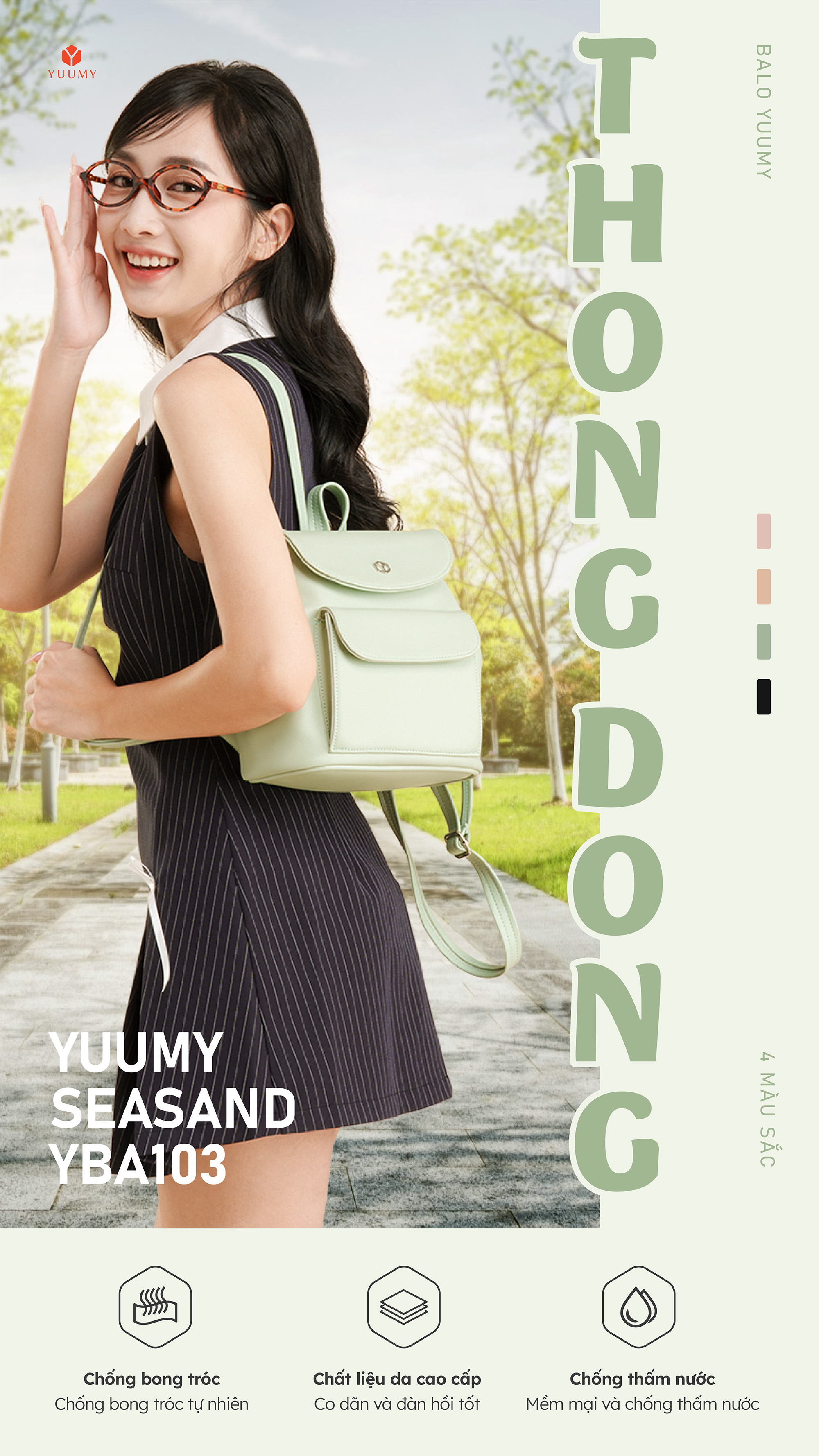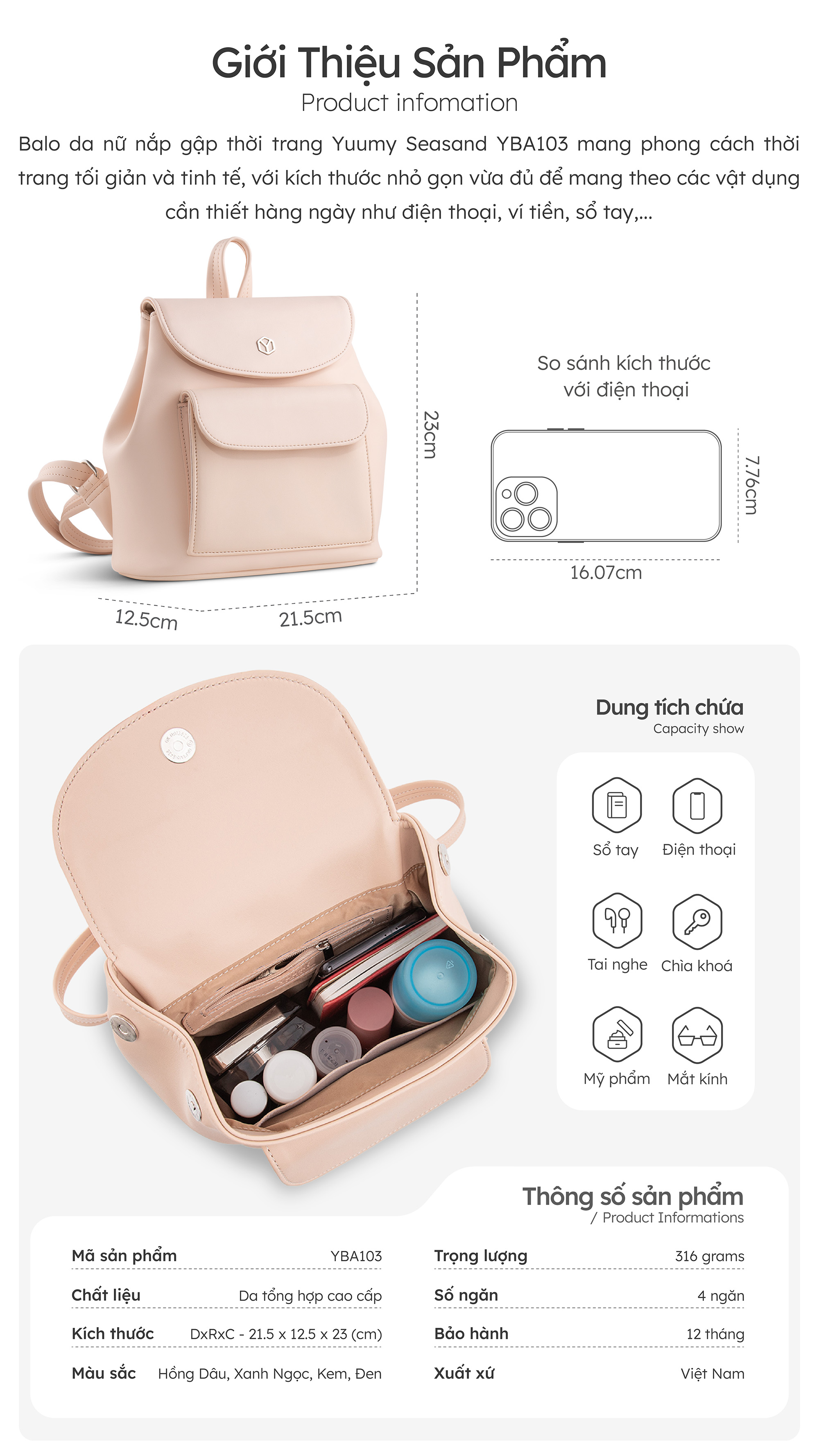 Balo da nữ nắp gập thời trang Yuumy Seasand YBA103 mang phong cách thời trang tối giản và tinh tế, với kích thước nhỏ gọn vừa đủ để mang theo các vật dụng cần thiết hàng ngày như điện thoại, ví tiền, sổ tay,...Được làm từ chát liệu da tổng hợp cao cấp chống thấm nước, chống xước và có độ bền cao. Phần nắp được thiết kế theo hình chữ nhật với các góc bo tròn mềm mại, hai bên hông balo có gắn thêm 2 khóa nam châm làm cho chiếc balo thêm phần nổi bật. Với các gam màu tươi sáng, bạn có thể mang nó khi đi làm, đi học hoặc trong các dịp dạo phố, du lịch ngắn ngày.