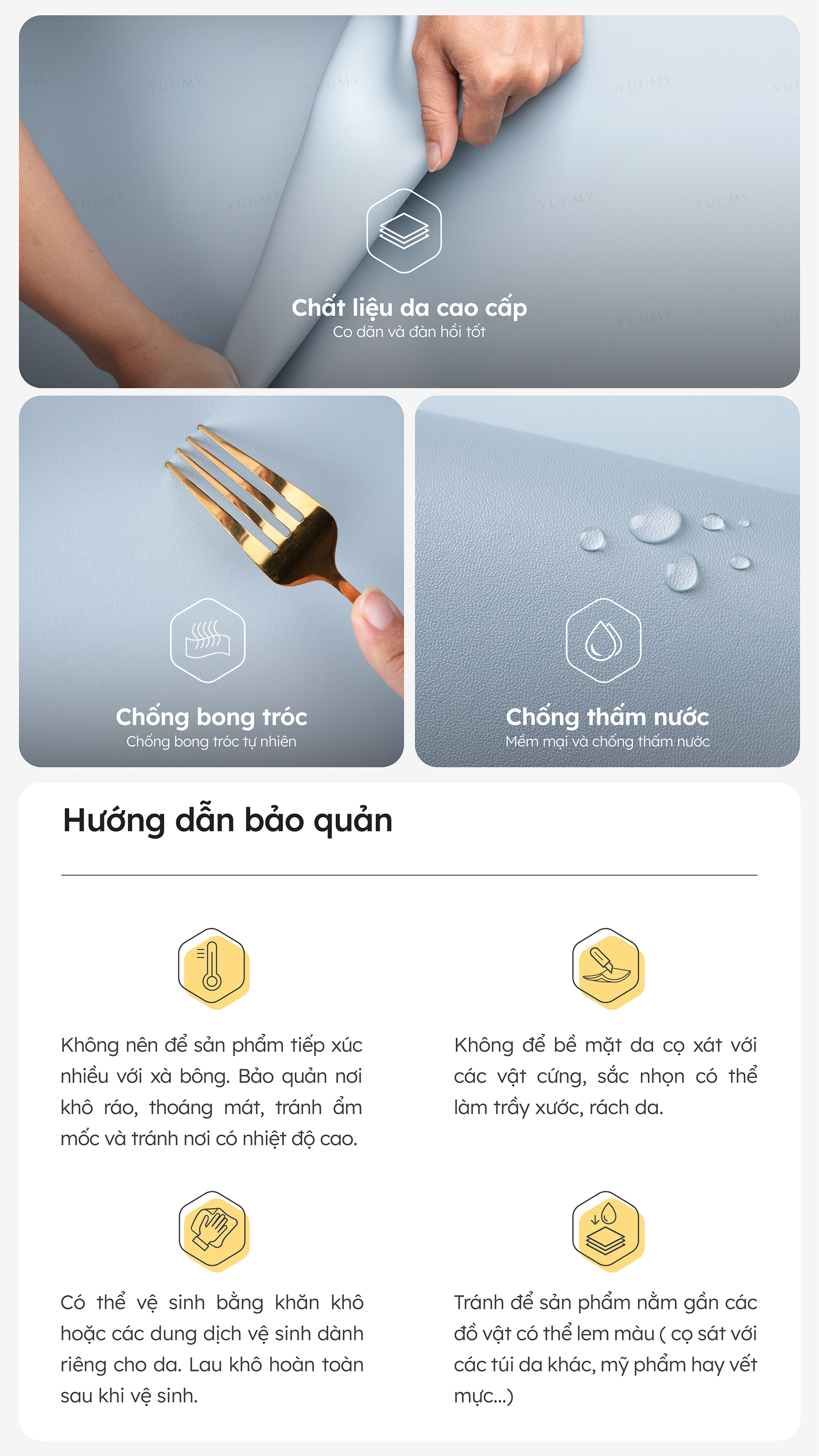 - Có thể vệ sinh bằng khăn khô hoặc các dung dịch vệ sinh dành riêng cho da