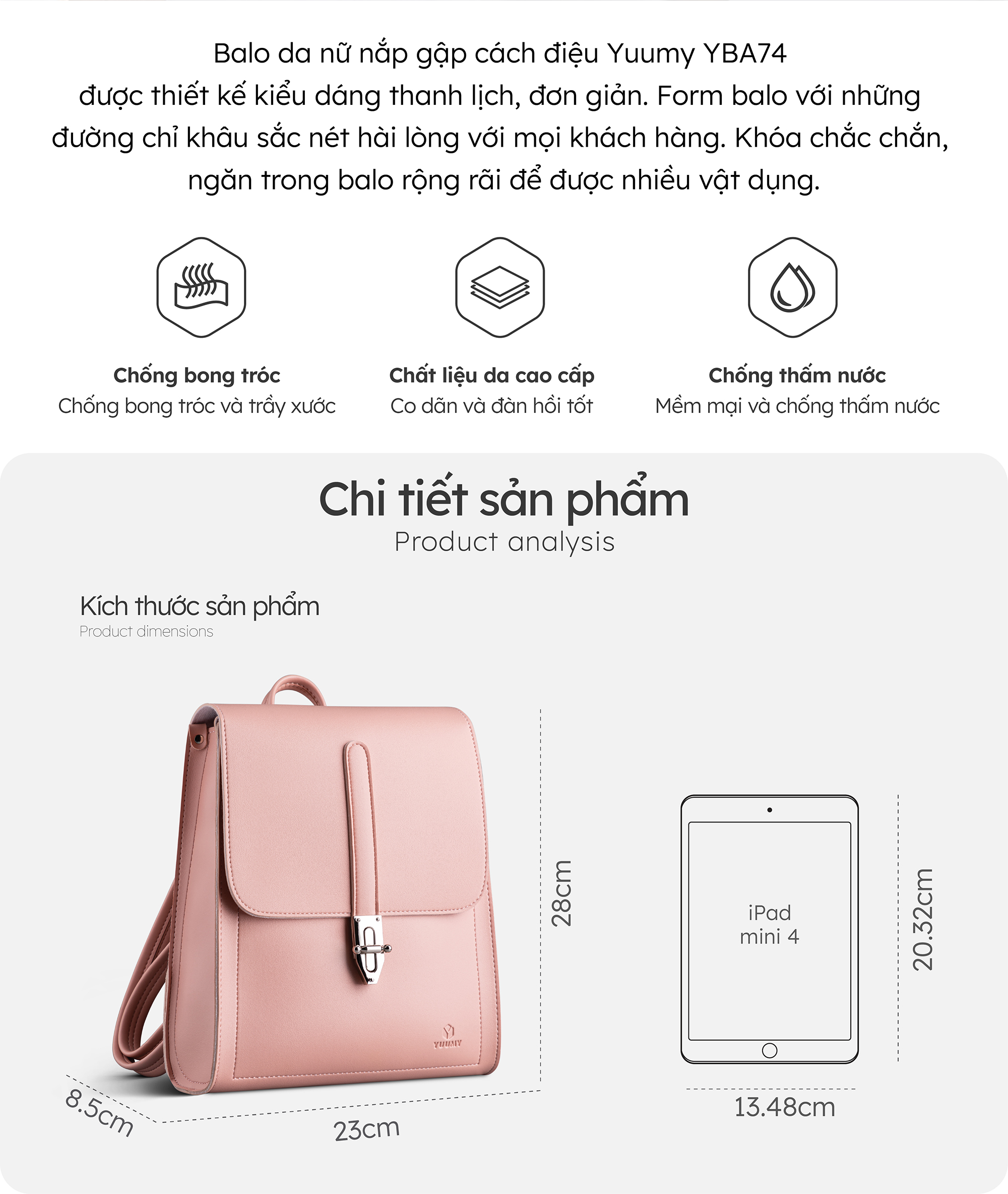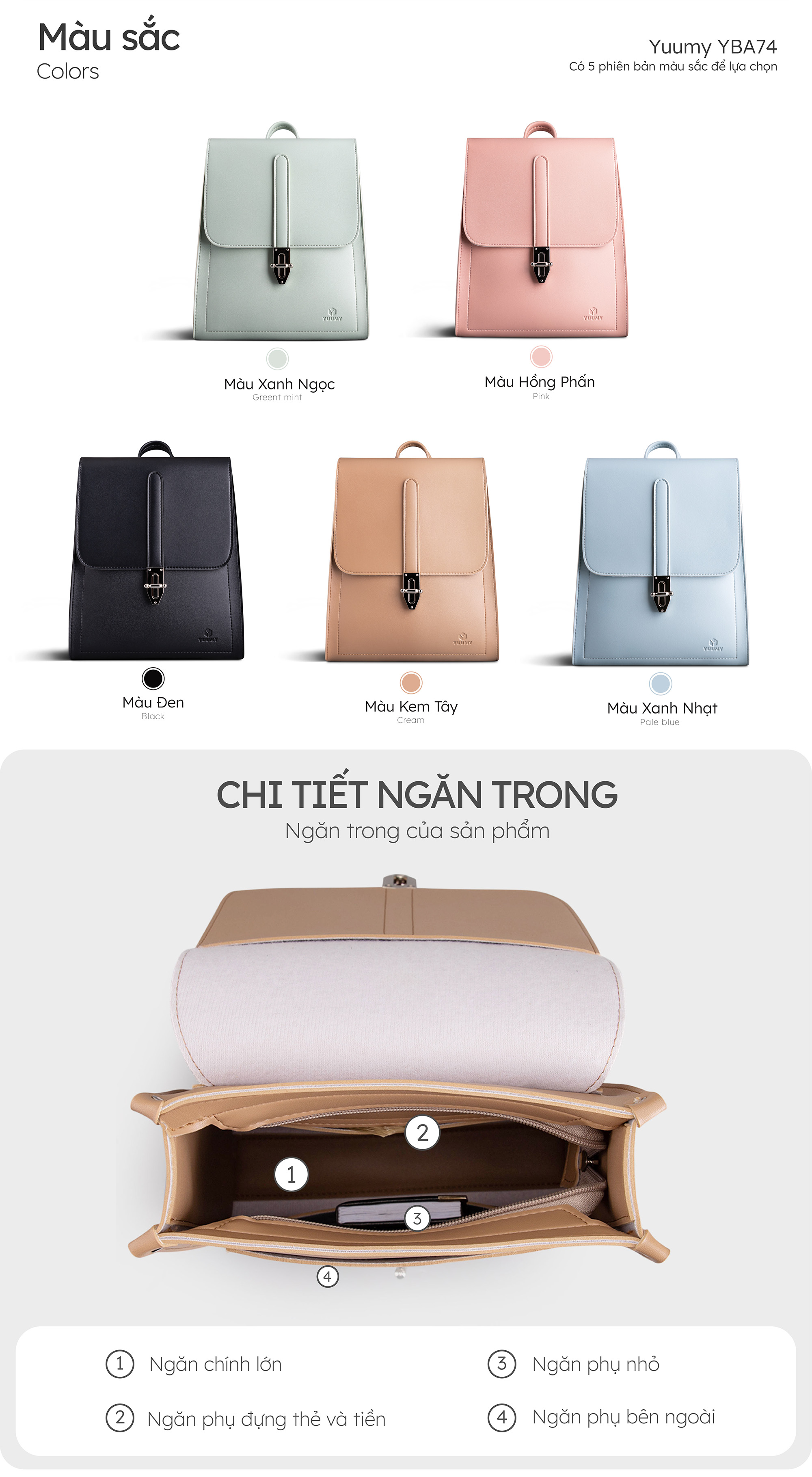 Balo da nắp gập Yuumy YBA74 từ kiểu dáng đến chất lượng đều có thể làm hài lòng người dùng. Thiết kế nắp gập đơn giản kèm khóa cài an toàn, ngăn trong rộng rãi để được nhiều vật dụng cần thiết khi ra ngoài: điện thoại, ví tiền, sổ tay, Được làm từ chất liệu da tổng hợp cao cấp cùng đường chỉ khâu tỉ mỉ, bạn hoàn toàn yên tâm khi mang chiếc balo này mọi lúc mọi nơi. Với những gam màu thanh lịch và thời trang, sản phẩm này sẽ làm bạn nổi bật hơn trong mắt người đối diện.