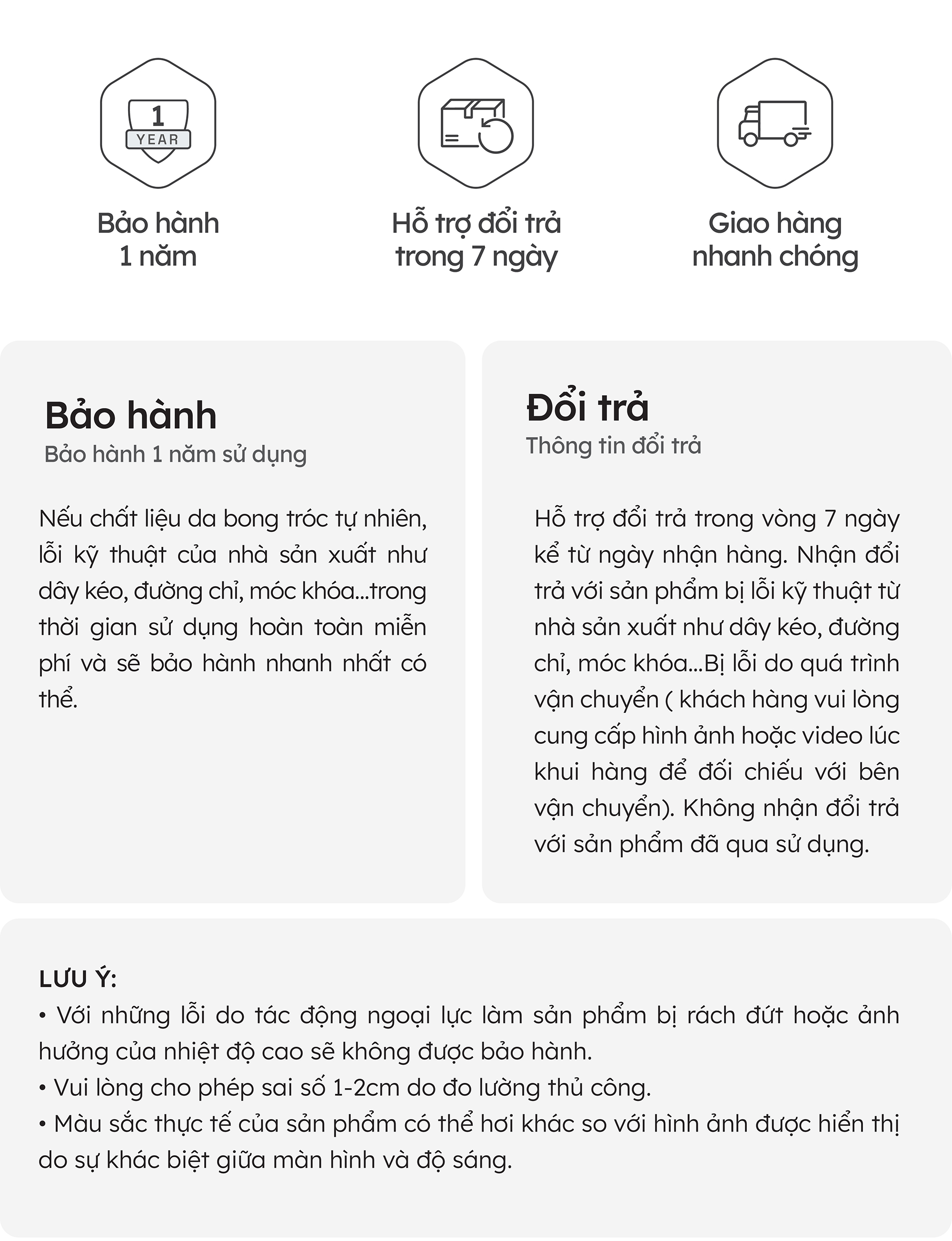 - Nhận đổi trả với sản phẩm bị lỗi kỹ thuật từ nhà sản xuất như dây kéo, đường chỉ, móc khóa…