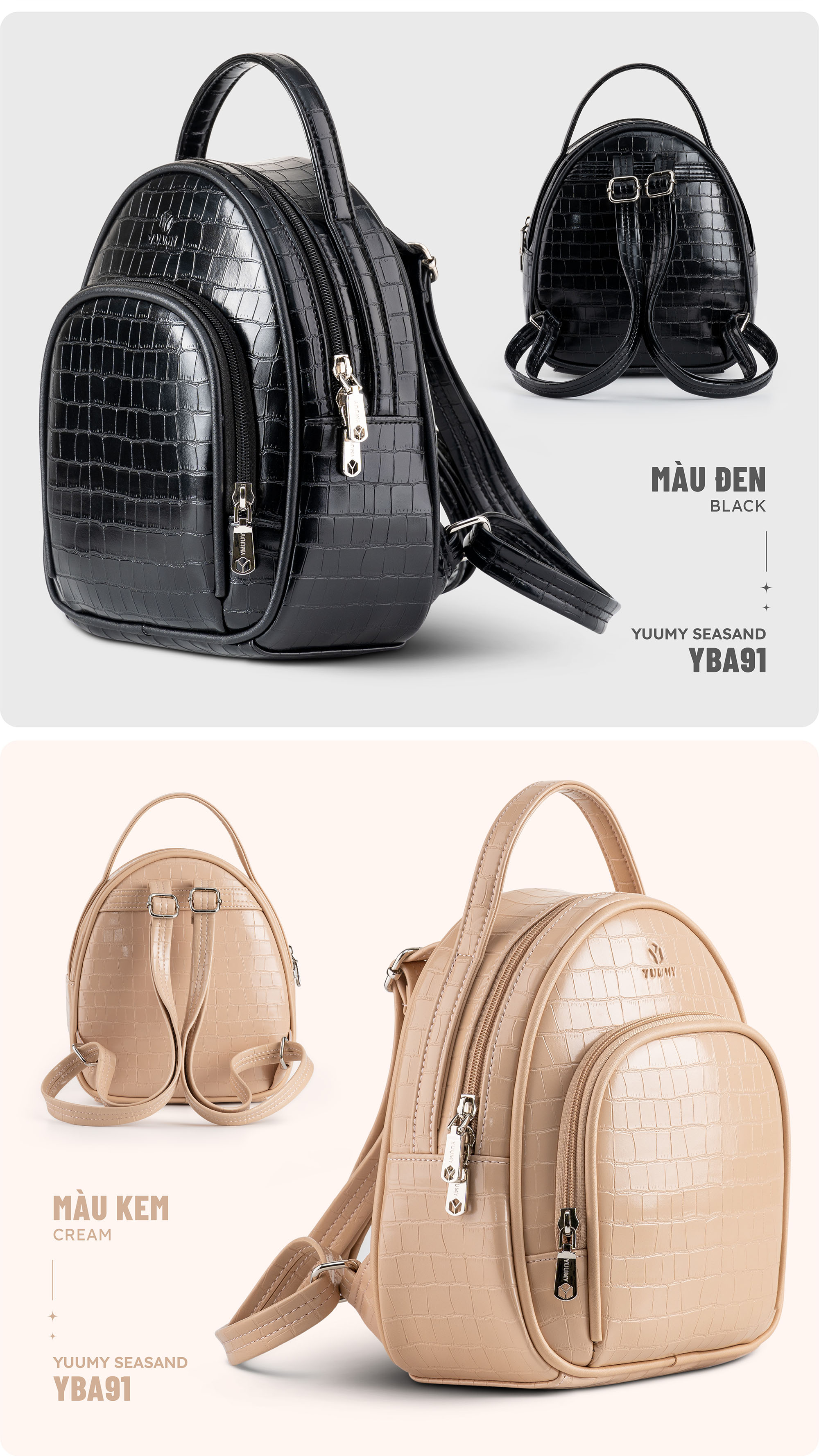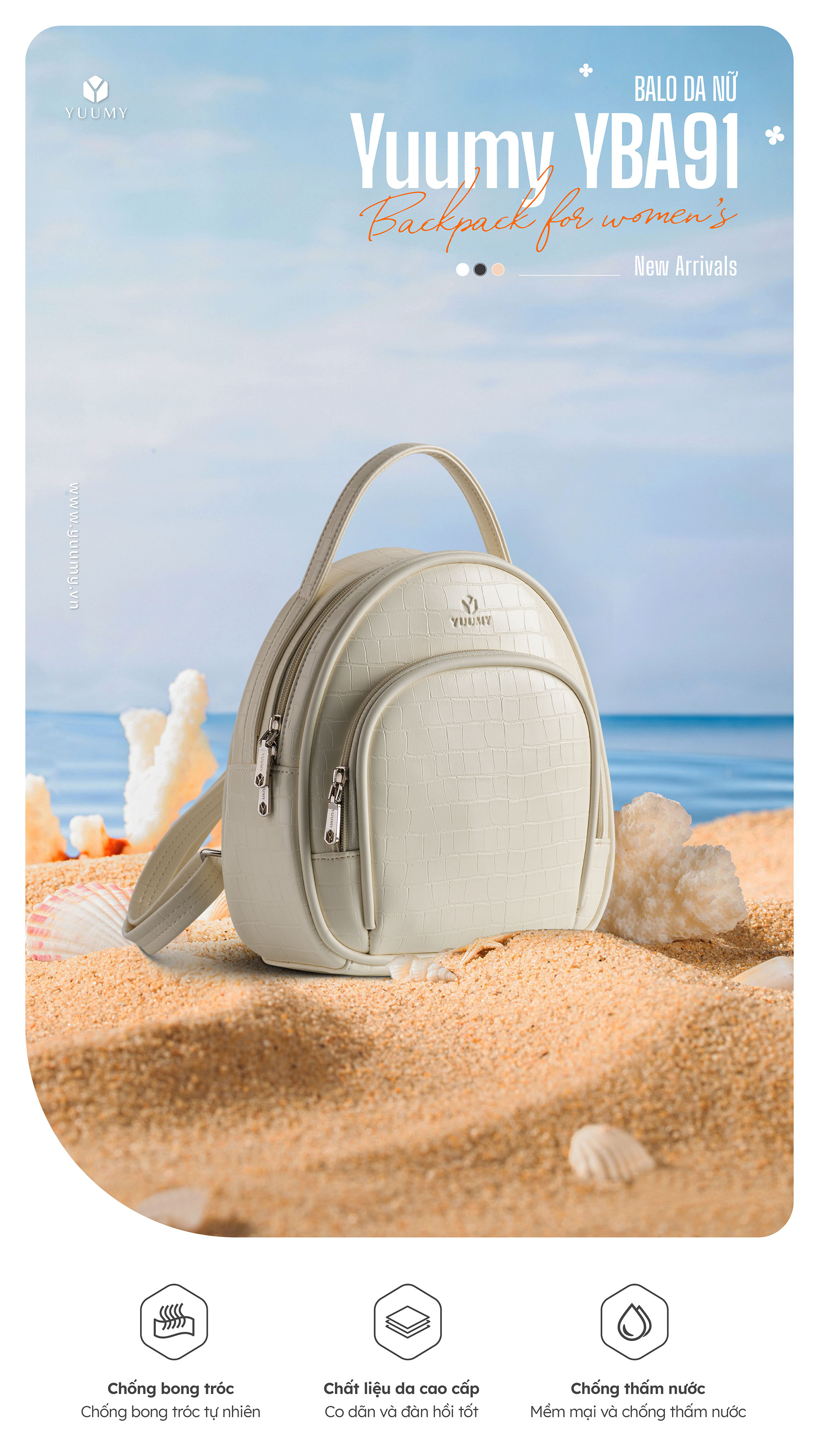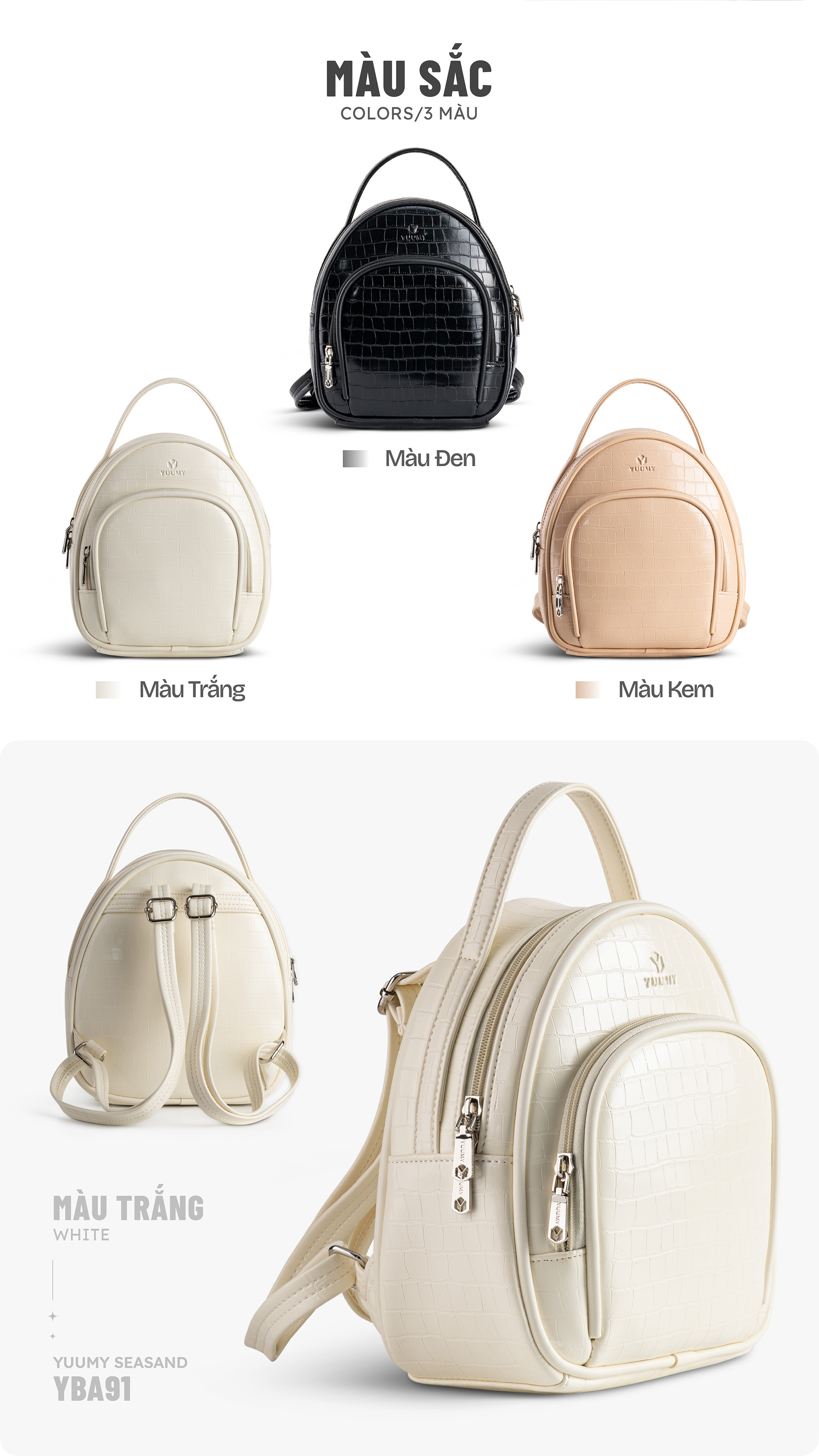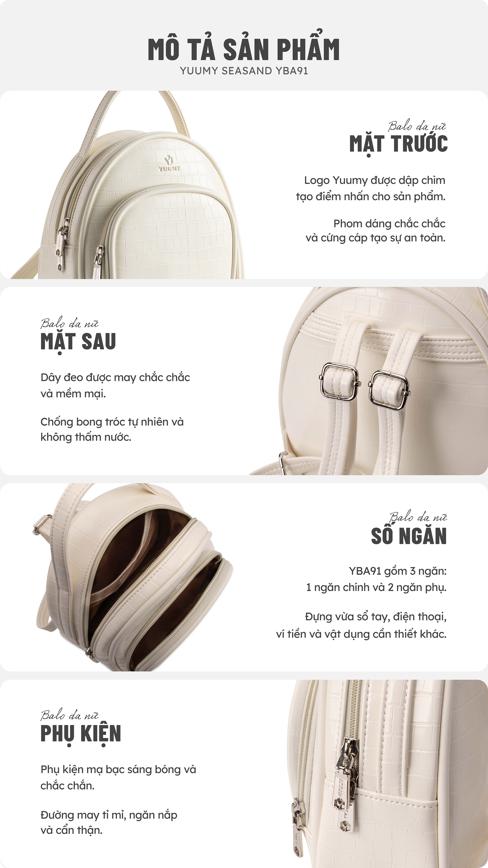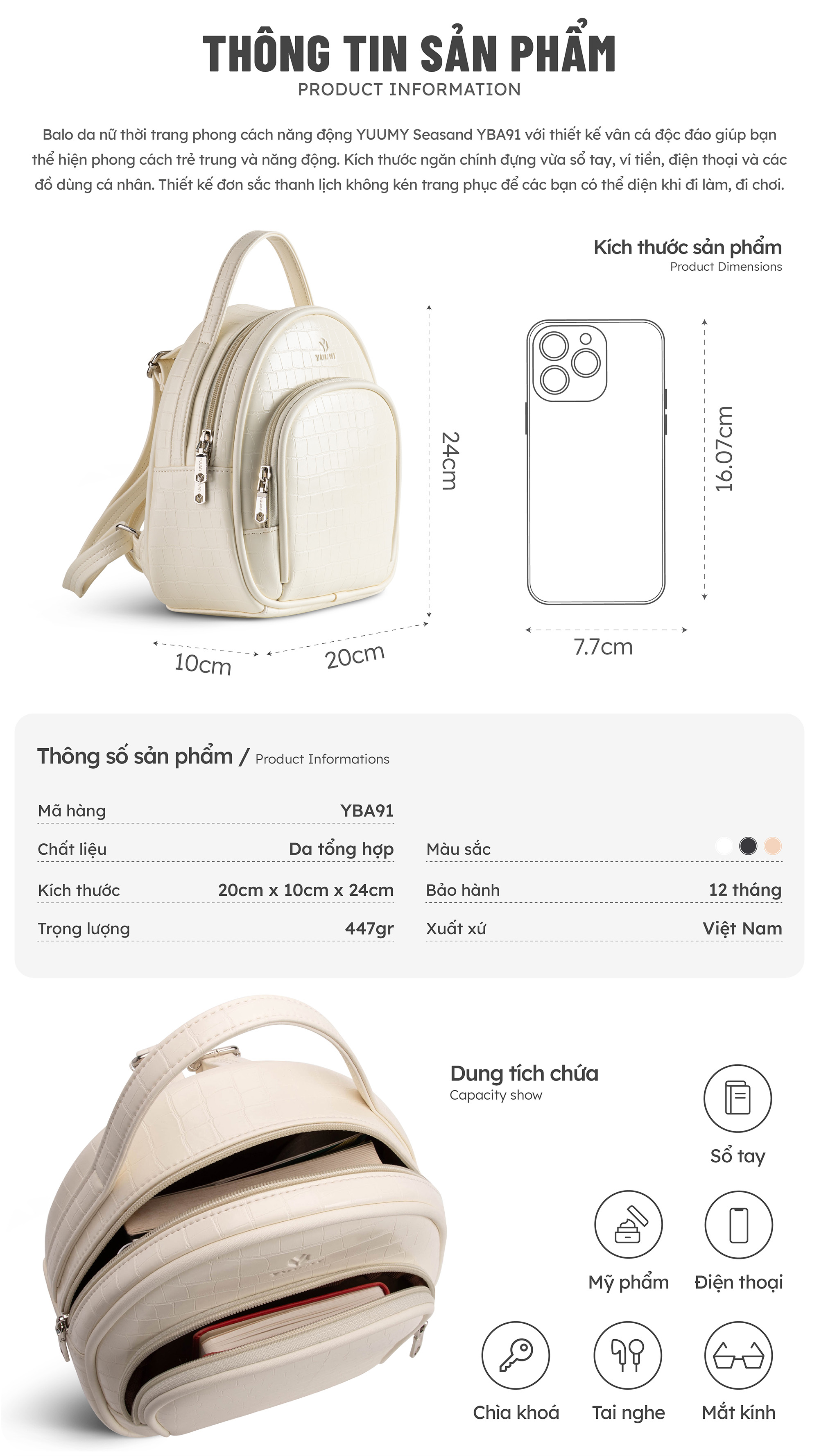 Balo da nữ thời trang phong cách năng động YUUMY Seasand YBA91 với thiết kế vân cá độc đáo giúp bạn thể hiện phong cách trẻ trung và năng động. Kích thước ngăn chính đựng vừa sổ tay, ví tiền, điện thoại và các đồ dùng cá nhân. Thiết kế đơn sắc thanh lịch không kén trang phục để các bạn có thể diện khi đi làm, đi chơi.