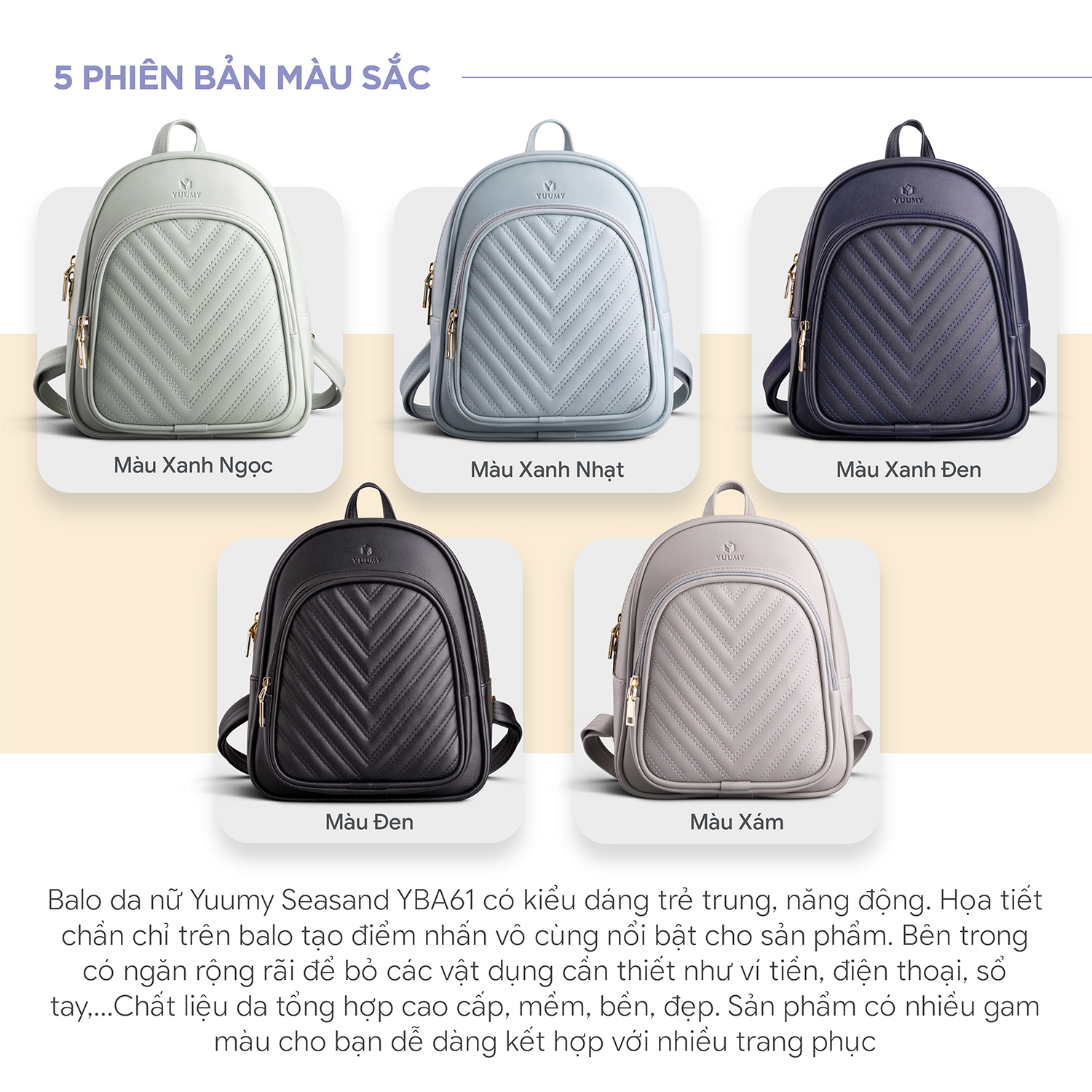 Balo da nữ Yuumy Seasand YBA61 có kiểu dáng trẻ trung, năng động. Họa tiết chần chỉ trên balo tạo điểm nhấn vô cùng nổi bật cho sản phẩm. Bên trong có ngăn rộng rãi để bỏ các vật dụng cần thiết như ví tiền, điện thoại, sổ tay,ất liệu da tổng hợp cao cấp, mềm, bền, đẹp. Sản phẩm có nhiều gam màu cho bạn dễ dàng kết hợp với nhiều trang phục