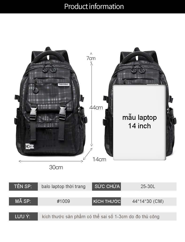 Kích thước: 30CM* 14CM* 30CM đựng vừa laptop 15.6 inch, A4