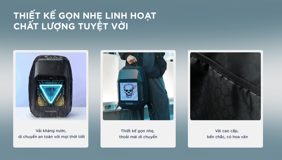 Bên cạnh cải tiến về màn hình LED và thiết kế thì chất liệu tạo nên sản phẩm cũng được làm từ chất liệu cao cấp và dễ dàng sử dụng.Với chất liệu vải Polyester Fiber Brazing dày dặn, chất lượng và bền bỉ và có kết cấu rõ ràng giúp nâng cao khả năng kháng nước và bên trong balo là một lớp vải dày dặn giúp chống va đập hiệu quả. Bạn có thể sử dụng thoải mái ở bất kì thời tiết nào và di chuyển thoải mái. Dây đeo cũng là một điểm vô cùng tinh tế của nhãn hàng khi được thiết kế mềm mại hơn để giảm tải trọng lượng trên vai người dùng.