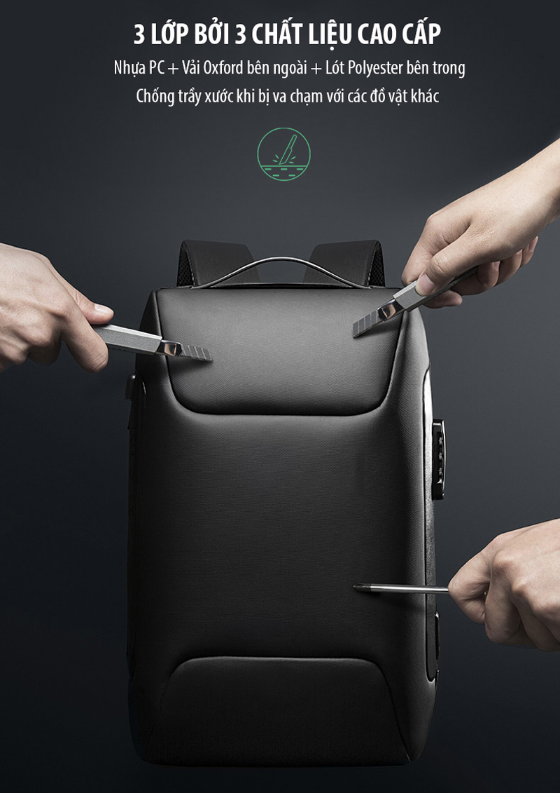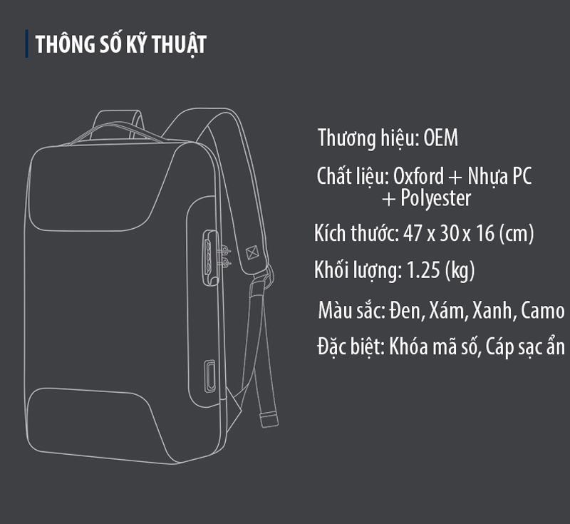 Balo đựng Laptop 15.6 inch từ chất liệu vải Oxford bên ngoài, nhựa PC cứng cáp ở giữa và lót Polyester chống thấm nước, hỗ trợ bạn đi mưa hay vô tình bị đổ tràn nước lên balo, chống trầy xước khi để chung các đồ vật sắc nhọn khác và hỗ trợ kháng bụi tối ưu trong quá trình sử dụng. Balo Macbook 15.6 inchcó kích thước 47 x 30 x 16 (cm) nhỏ gọn, chỉ 1.25 (kg) siêu mỏng nhẹ, vừa tầm tay dễ cầm nắm hay mang đi bất cứ đâu mà không bị vướng víu. Balo chứa được tải trọng lớn 20 - 35 (L) giúp bạn đựng được nhiều đồ vật: đồ cá nhân, laptop, quần áo, tránh bị quên khi ra ngoài.Balo Laptop 15.6 inch được thiết kế mở tối đa là 180 độ. Balo tổng quan được thiết kế là hình hộp đứng với dây kéo chắc chắn, êm, mượt, dễ sử dụng để đựng rất nhiều đồ vật theo bạn đi làm, đi chơi hay những chuyến du lịch ngắn ngày.Balo du lịch đựng Laptop gồm một ngăn chính lớn: Phía sau là 2 ngăn chống sốc: ngăn lớn đựng được Laptop, Macbook tối đa 15.6 inch có đệm mút dày, ngăn nhỏ dùng đựng iPad, Kindle, Notebook, kèm đai gắn cố định giữ thiết bị không bị rơi ra ngoài hay bị lắc qua lại, mang lại hiệu quả chống sốc tốt nhất. Phía trước có 2 ngăn phụ rời đựng pin sạc dự phòng, chuột máy tính, cáp sạc, adapter, Khoảng rộng còn lại bạn có thể đựng quần áo, tài liệu, sách vở, rất thoải mái. Bên hông trái kèm ngăn phụ có đầu khóa kéo dùng để đựng chai nước, tiền lẻ, thẻ xe, để có thể dễ dàng lấy/cất.Quai đeo của Balo thiết kế đệm lưới thoáng khí, được may bằng kỹ thuật gấp mép dây viền, thiết kế ôm rất sát hai vai. Chức năng 2 trong 1 bởi quai cầm bọc da êm mịn rất chắc chắn được may phía trên quai đeo dùng để xách gọn gàng. Mặt lưng có túi Zip khóa kéo của balo có thể đựng điện thoại, ví tiền, vật quan trọng, tránh móc túi hay rơi rớt cũng là điểm nổi bật ở balo này. Khóa mật mã số bảo vệ an toàn hơn và tránh xâm nhập từ bên ngoài.*** Cách đổi mật khẩu mã khóa số:Ban đầu Balo đều có mã số 000, bạn có thể giữ nguyên hoặc đổi theo những con số bạn muốn. Cầm balo nằm nghiêng sao cho các con số hướng về phía bạn. Sau đó xoay các số thành số 000 rồi dùng ngón cái đặt vào nút đẩy về phía trái, các đầu khóa kéo sẽ bật ra. Còn nếu muốn đổi thì: Bước 1: Sau khi các đầu khóa kéo bật ra, bạn dùng đầu bút bi hoặc cây tăm ấn vào lỗ tròn nhỏ phía trên nút đẩy sẽ có tiếng tic nhỏ sau đó xoay nút số mà các bạn muốn thay đổi.Bước 2: Đẩy nút đẩy lại lần nữa để xác nhận mật khẩu mới. Bạn đã đổi mật khẩu thành công.Lưu ý: Các nút số xoay còn mới nên hơi gì rít, bạn cứ xoay bình thường thôi nhé!Điểm nổi bật của balo là cáp sạc ẩn, bên hông phải của balo có một cổng gồm USB & Micro-USB giúp bạn có thể để dàng cắm dây sạc điện thoại vào. Tuy nhiên nó chỉ là một cổng USB nối dài, để sạc được thì bạn cần phải có cục sạc dự phòng ở bên trong. Cũng cần lưu ý là bạn cần sử dụng loại sạc dự phòng mà cắm USB vào là tự động sạc, chứ loại phải nhấn nút thì phải mở ba lô ra kích hoạt thì mới sử dụng được. Tính năng mới này vô cùng tiện lợi và an toàn khi dùng điện thoại đang sạc.Balo Macbook 15.6 inch có cấu trúc chắn chắn, an toàn cho ngưới dùng, tỉ mỉ từng đường kim mũi chỉ, khóa kéo có đầu dài giúp cầm kéo một cách nhẹ nhàng không bị gì rít, quai đeo có thể điều chỉnh nới dài – thu ngắn theo chiều cao người dùng vô cùng linh hoạt. Đặc biệt, mặt lưng balo là đệm lưới cao cấp giúp thoát nhiệt nên sẽ không bị ướt lưng áo và còn chống gù lưng, an tâm sử dụng mỗi ngày. Cuối quai đeo đựng thẻ Card chống ướt tiện lợi khi sử dụng. Balo sang trọng màu Đen, Xám, Xanh đậm, Camo: