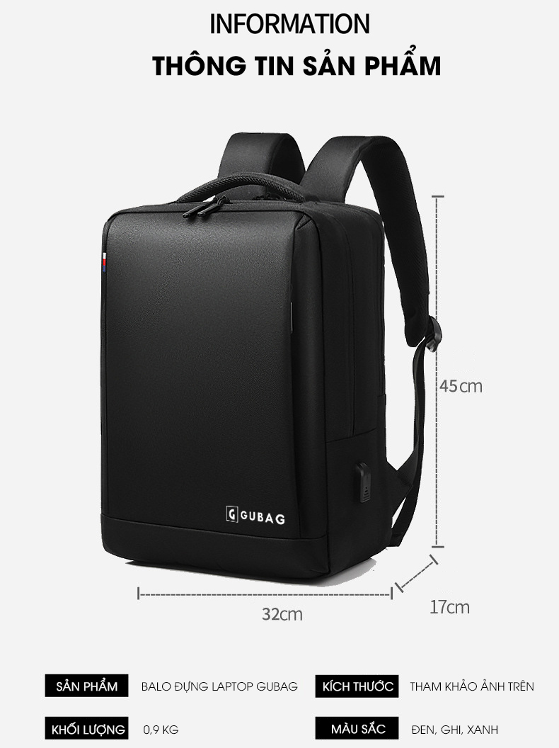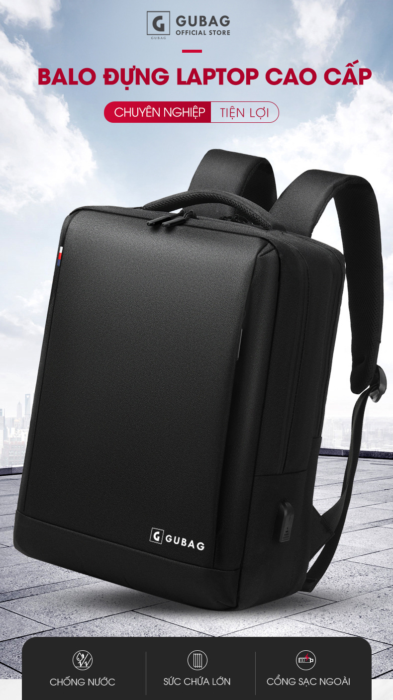 Balo nam cao cấp GuBag, dung tích lớn, cổng sạc Usb ngoài, chống chày xước. Thiết kế nhiều ngăn tiện lợi, ngăn đựng laptop rộng, vừa laptop tới 15,6inch.