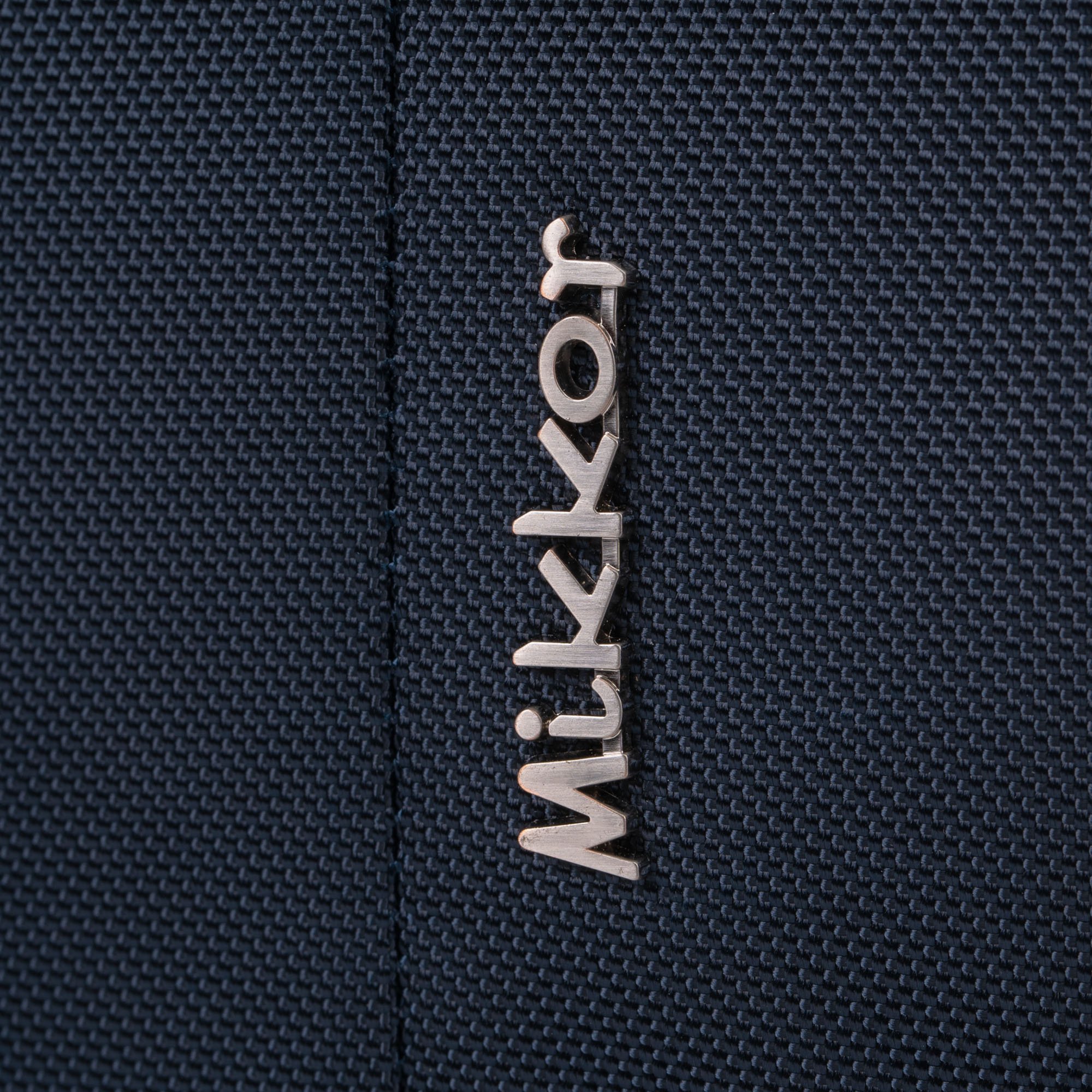 Mặt trước balo đính logo chú sói biểu tượng thương hiệu và logo hợp kim MIKKOR nổi bật.