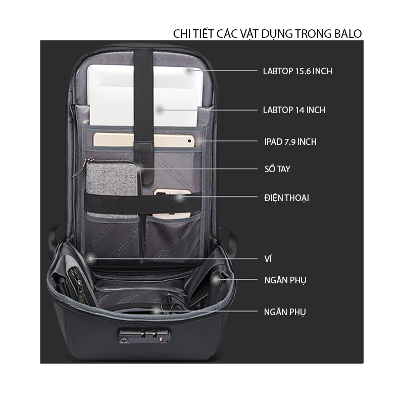 Chức năng: thoáng khí, chống mài mòn, làm sáng, chống sốc, siêu chống nước, ngăn chính rộng rãi, có đầu USB sạc điện thoại