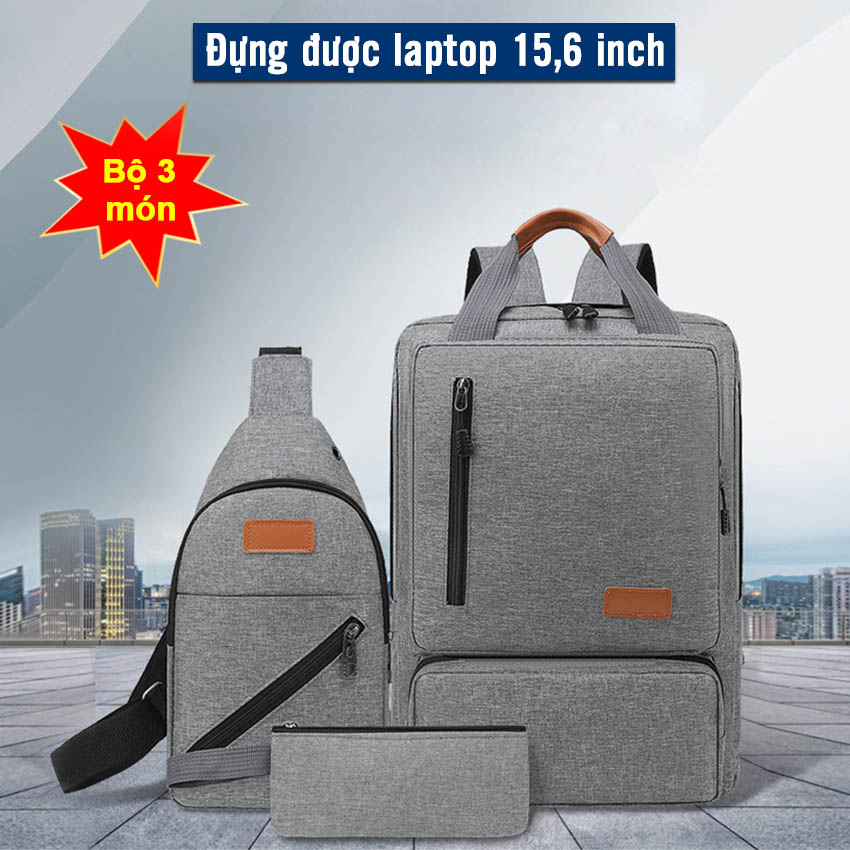 Balo nam nữ B1087 NASI Store bộ 3 sản phẩm gồm ba lô laptop 15,6 inch học sinh đi học đi làm công sở túi đeo chéo có lỗ sạc tai nghe đi chơi du lịch bóp vải