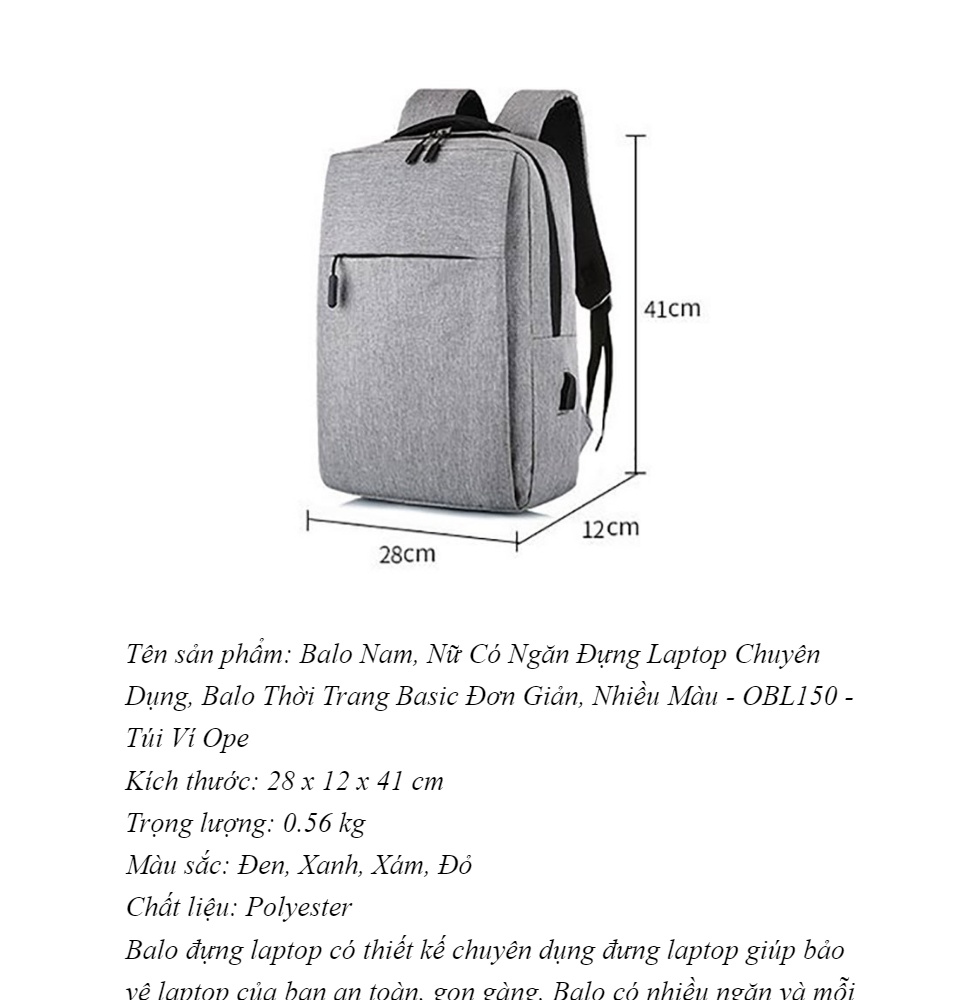 Tên sản phẩm: Balo Nam, Nữ Có Ngăn Đựng Laptop Chuyên Dụng, Balo Thời Trang Basic Đơn Giản, Nhiều Màu - OBL150 - Túi Ví OpeKích thước: 28 x 12 x 41 cmTrọng lượng: 0.56 kgMàu sắc: Đen, Xanh, Xám, Đ...