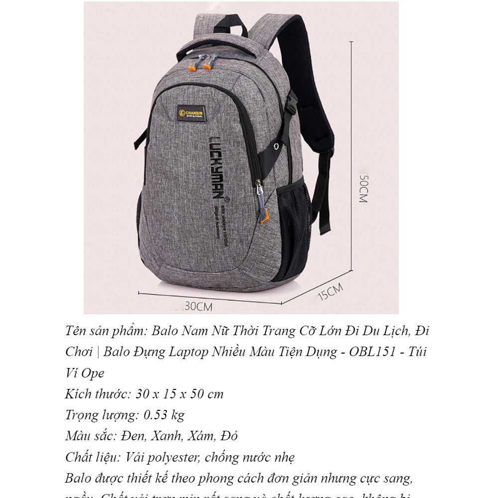 Tên sản phẩm: Balo Nam Nữ Thời Trang Cỡ Lớn Đi Du Lịch, Đi Chơi | Balo Đựng Laptop Nhiều Màu Tiện Dụng - OBL151 - Túi Ví Ope