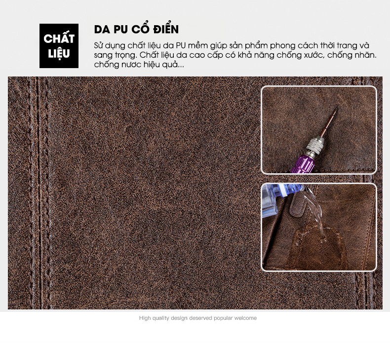 - Chất liệu da PU chống thấm tốt, sợi Polyester bền chắc, đường may tỉ mỉ, tinh tế.