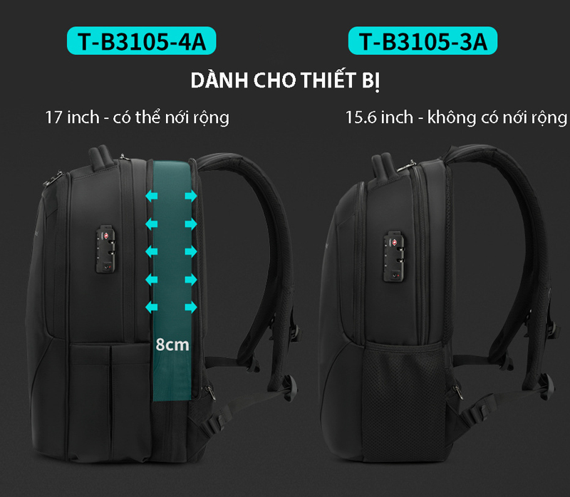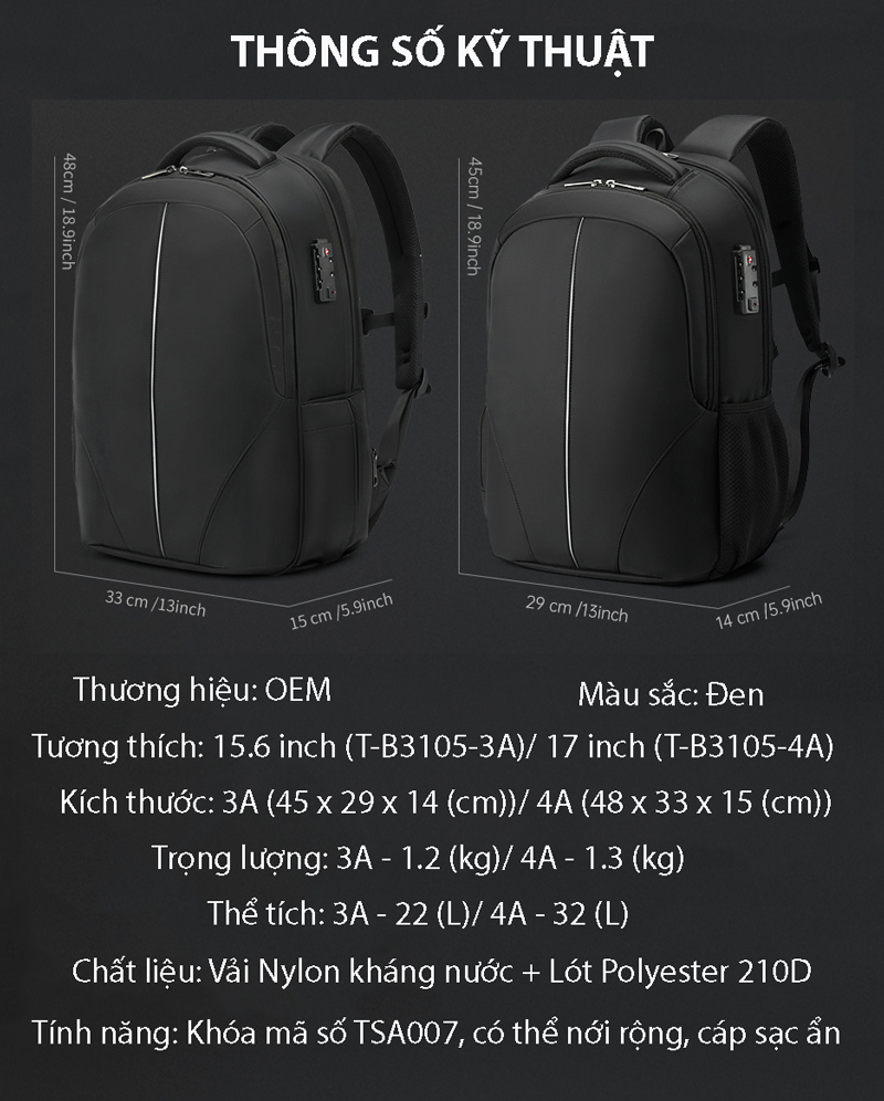 Balo Macbook có 2 lựa chọn: tương thích với thiết bị 15.6 inch và thiết bị 17 inch.15.6 inch -T-B31053A:có kích thước 45 x 29 x 14 (cm) nhỏ gọn chỉ 1.2 (kg) chứa được tải trọng 22 (L)17 inch -T-B31054A: có kích thước 48 x 33 x 15 (cm) nhỏ gọn chỉ 1.3 (kg) chứa được tải trọng 32 (L)