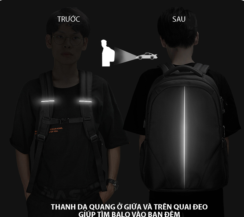 Balo màu Đen sang trọng và nổi bật nhờ thanh dạ quang ở giữa balo và trên quai đeo giúp tìm kiếm balo vào ban đêm.