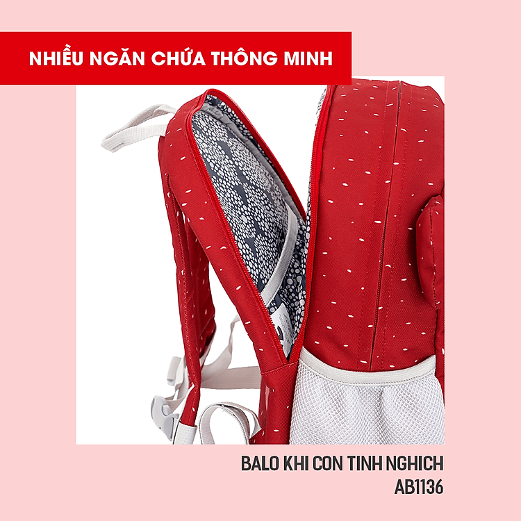 Balo đi học AB1136 được thiết kế nhiều ngăn chứa thông minh để bé có thể mang đầy đủ các vật dụng cần thiết dù là đi học hay đi chơi. Ngăn chính balo rộng rãi được tách biệt để chứa quần áo cho bé: ngăn chứa quần áo sạch và ngăn chứa quần áo. Vải lót được làm từ chất liệu 210D hạn chế thấm nước và không gây ẩm mốc cho quần áo của bé.