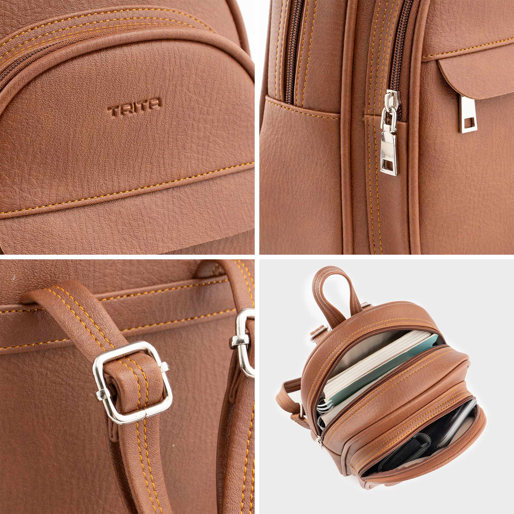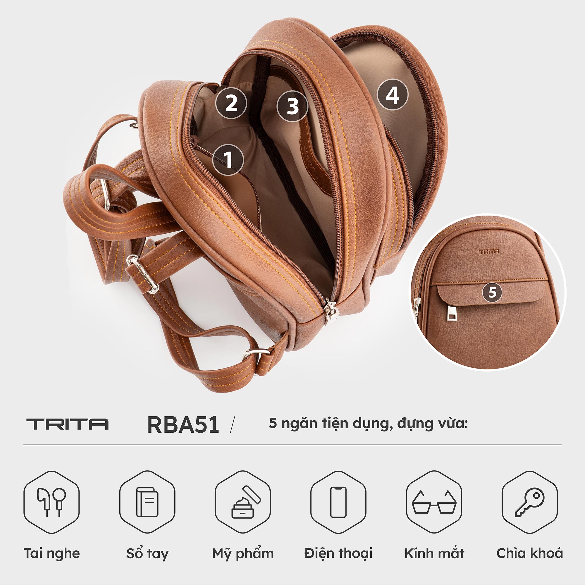 Balo da nữ đa ngăn tiện dụng Trita RBA51 được thiết kế 3 ngăn khóa riêng biệt một cách khoa học, ngăn chính còn trang bị thêm 2 ngăn phụ để người dùng phân ngăn bảo quản và dễ nhớ nơi cất vật dụng. Bên cạnh đó việc sử dụng chất liệu da tổng hợp cao cấp không chỉ chống thấm nước giúp bảo vệ đồ đạc bên trong như tiền bạc, giấy tờ, điện thoại,...tốt hơn mà còn tăng tính thẩm mỹ của sản phẩm. Người dùng sử dụng để mang đi chơi, đi học, đi làm đều rất phù hợp.