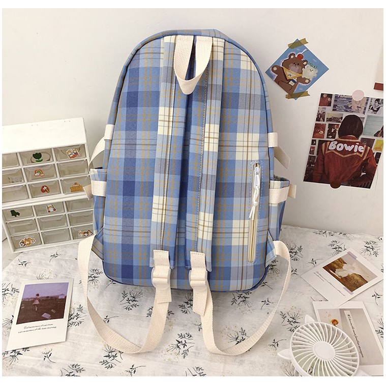 Giới thiệu Balo vải canvas phối kẻ tặng sticker và móc gấu bông kute