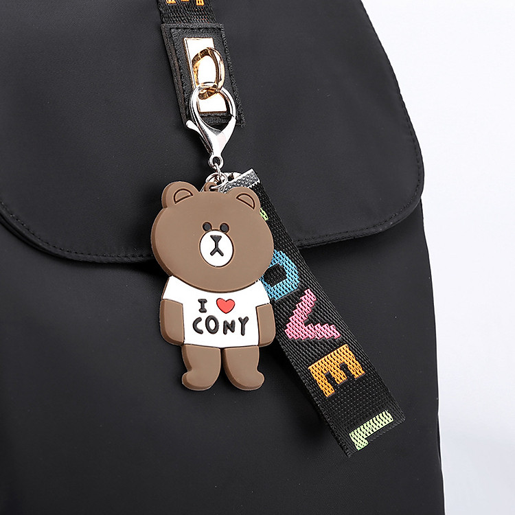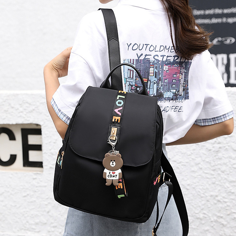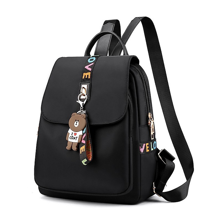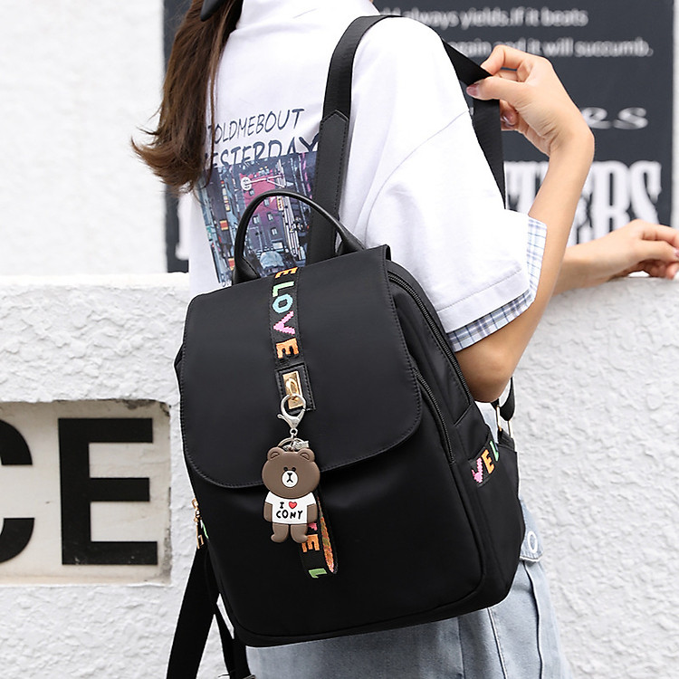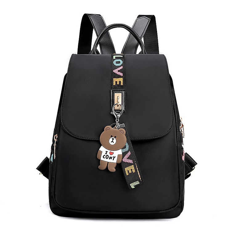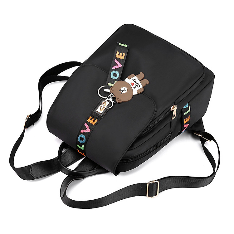 Balo cũng được nhấn nhá họa tiết nổi và kèm móc khóa gấu nâu đầy ấn tượng dễ thương