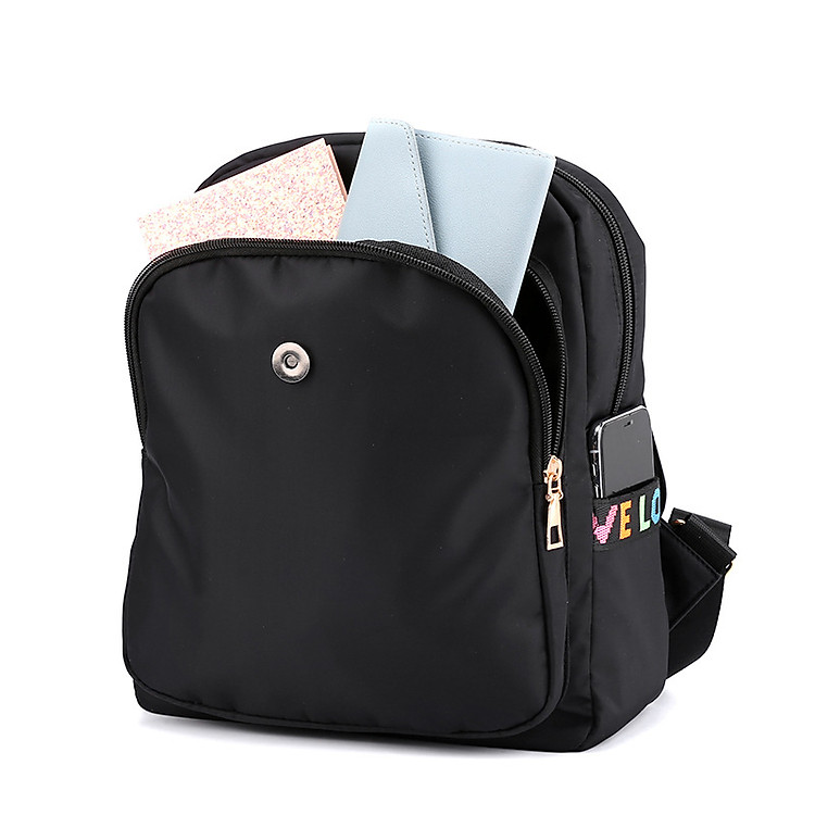 Balo bao gồm 2 ngăn lớn để những vật dụng như ô dù, điện thoại, đồ trang điểm, khăn giấy, sổ tay, bút, ví tiền, sạc điện thoại, … để đi học, đi làm hoặc một vài đồ nhỏ để đi xa.