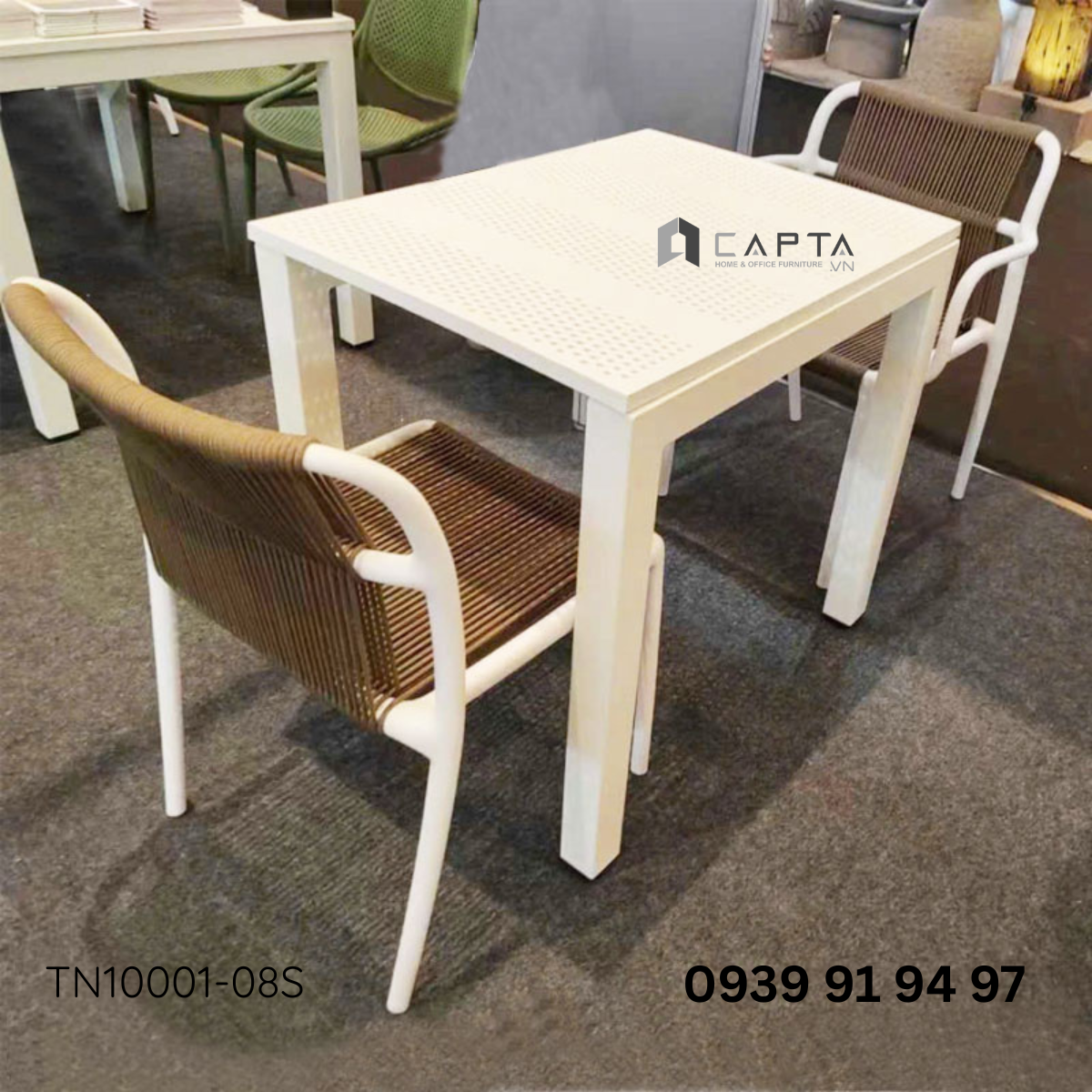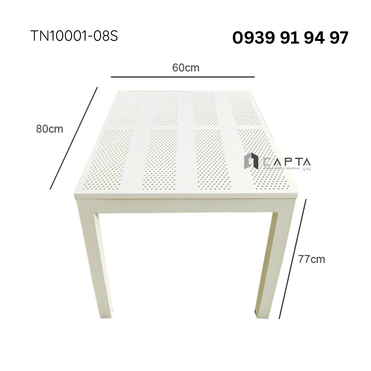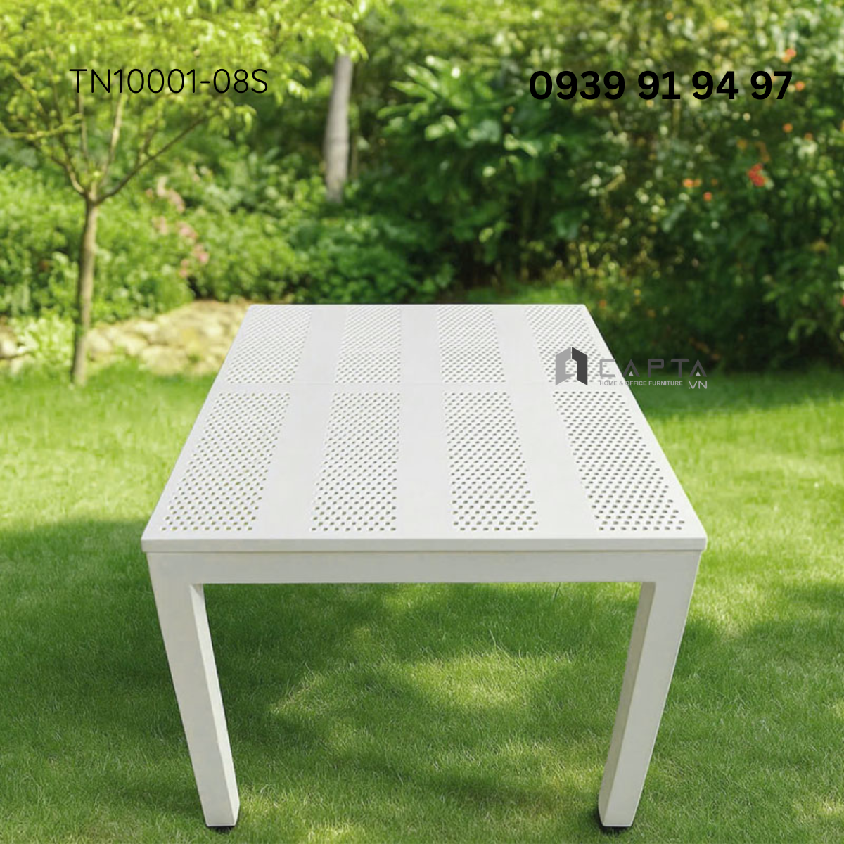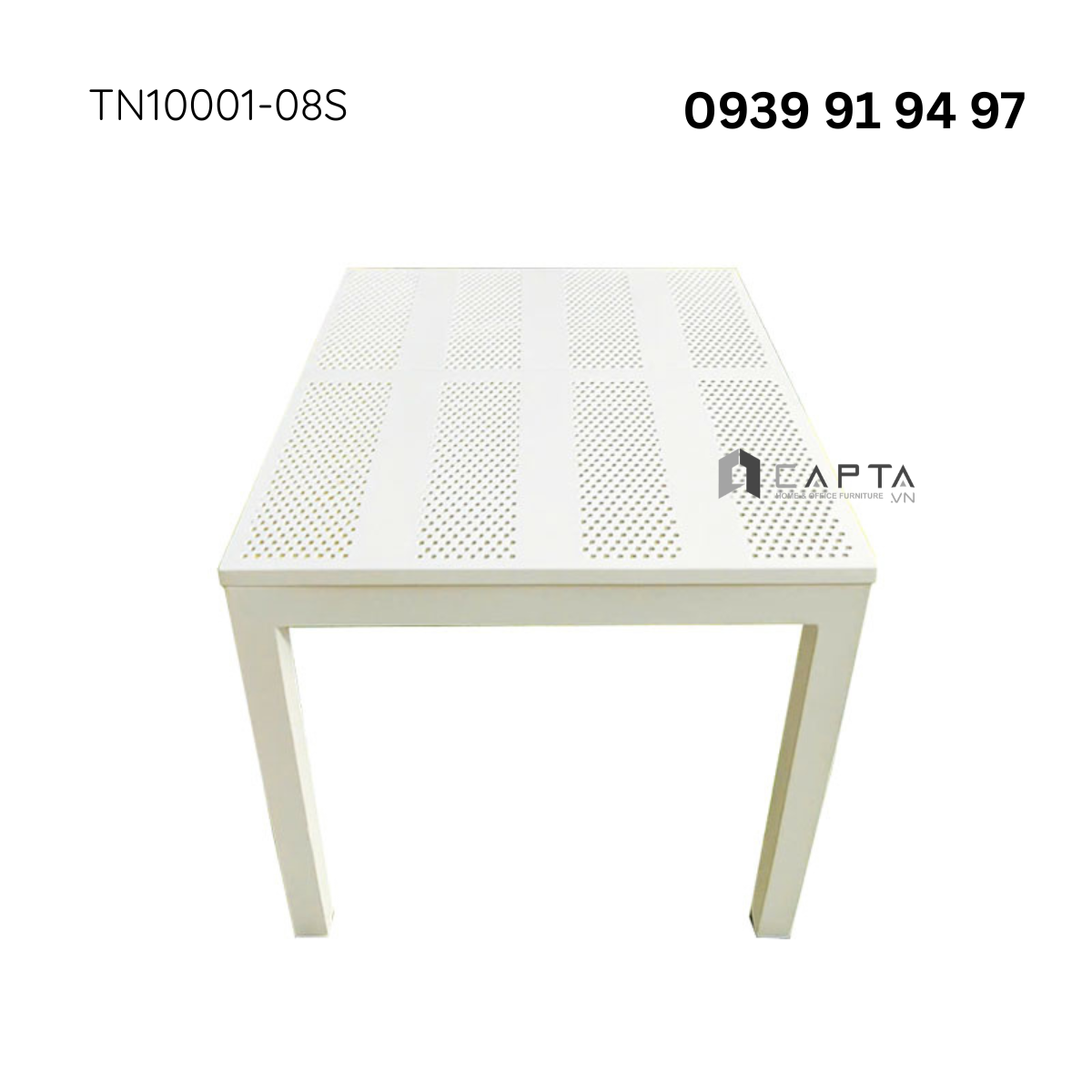 Bàn nhà hàng ngoài trời nhỏ gọn TN10001-08S có mặt bàn nhựa cứng cáp, chống va đập tốt. Thiết kế có lổ giúp thoát nước mưa không gây ứ đọng khi dùng. Tone bàn màu trắng tinh tế thanh thoát phù hợp làm bàn tiệc, bàn nhà hàng giúp tạo không gian sang trọng và nổi bật.