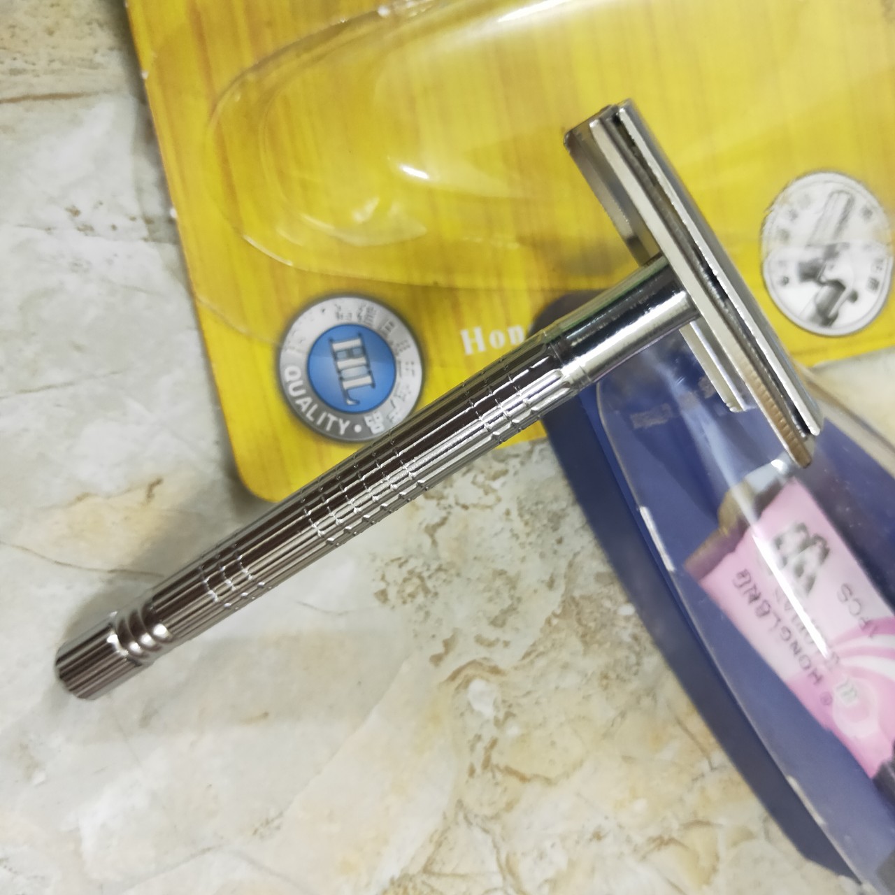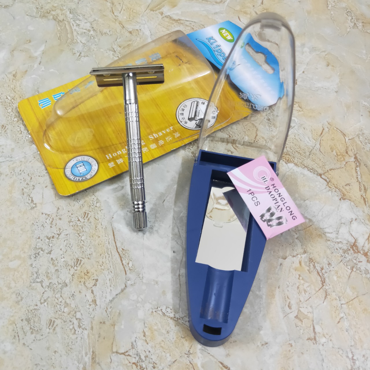 Bàn Cạo Râu Inox Hoàng Long HL Klipper kèm lưỡi Lam không rỉ với chế đọ Xoay cán bàn Full Hộp