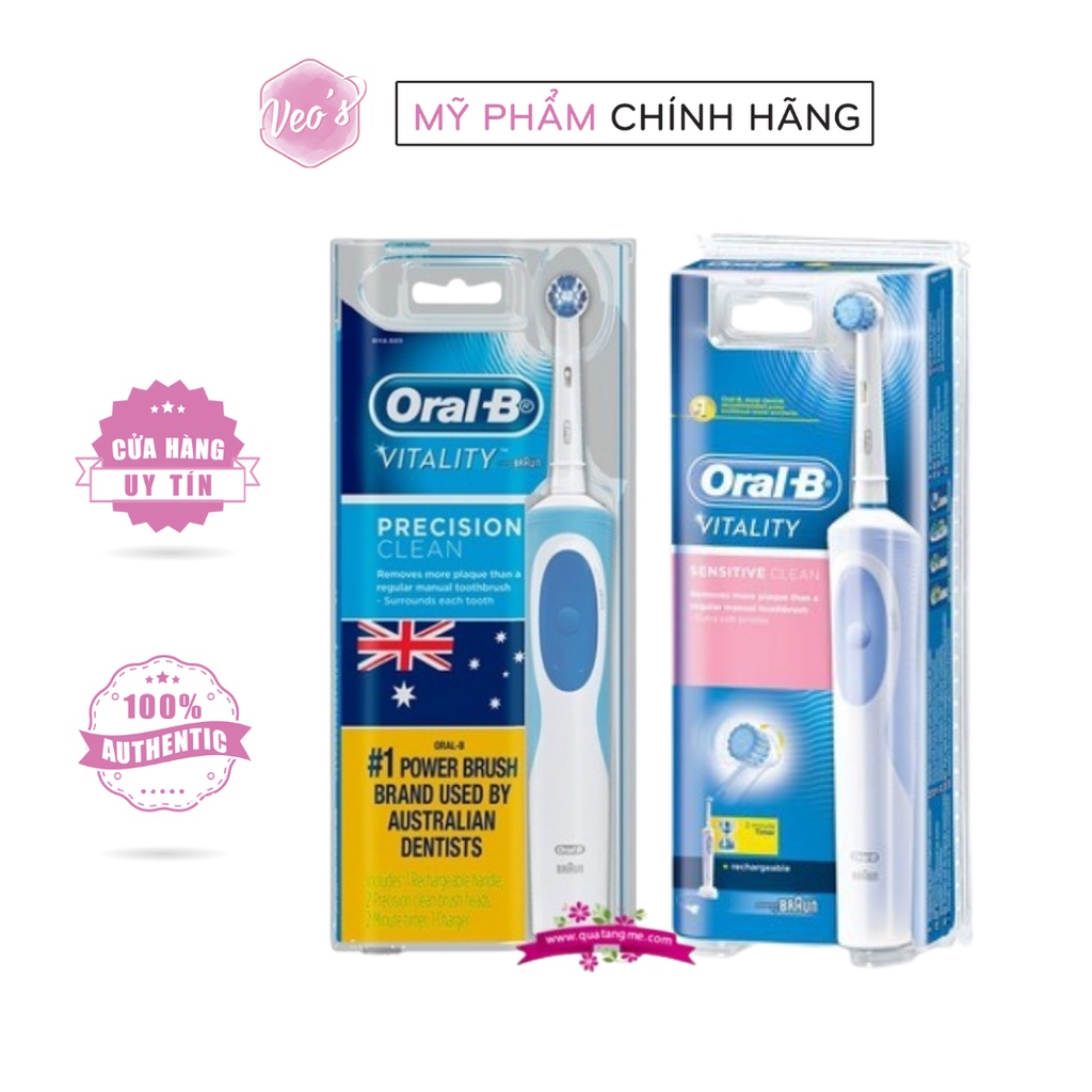 1. Bàn chải điện Oral-B Vitality Sensitive Clean Bàn chải điện Oral-B Vitality Precision Clean được thiết kế chế độ chải thích hợp với tốc độ quay 7.600 vòng/ phút, đúng tiêu chuẩn, nhiều tiện ích với tính năng làm sạch thức ăn bám dính trên răng, chống mảng bám ố vàng và hạn chế cao răng. Đặc biệt với chệ độ rung an toàn tạo cảm giác thoải mái khi đánh răng.