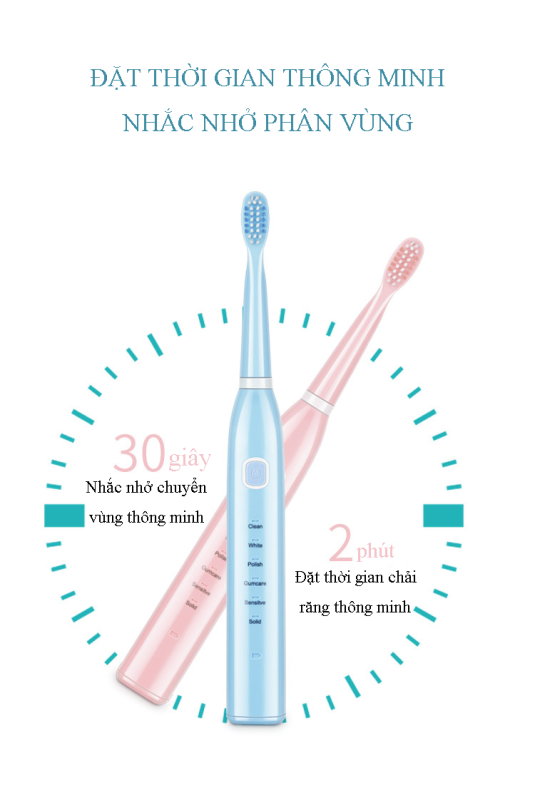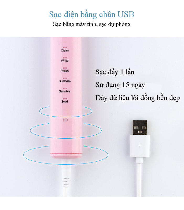 Hẹn giờ thông minh: bộ hẹn giờ cứ mỗi 30 giây sẽ dừng 3 giây để nhắc người dùng chuyển vùng đánh răng. An toàn: Lông bàn chải mịn, chống rơi, chống tách ra, xử lý bằng công nghệ mài tròn. 6 chức năng rung: rửa, làm sạch, đánh bong, bảo vệ răng, chống ê buốt, làm chắc răng. Xử lý mọi vấn đề về răng miệng Sử dụng tiện lợi: sạc USB, sạc đầy có thể sử dụng tới 30 ngày.