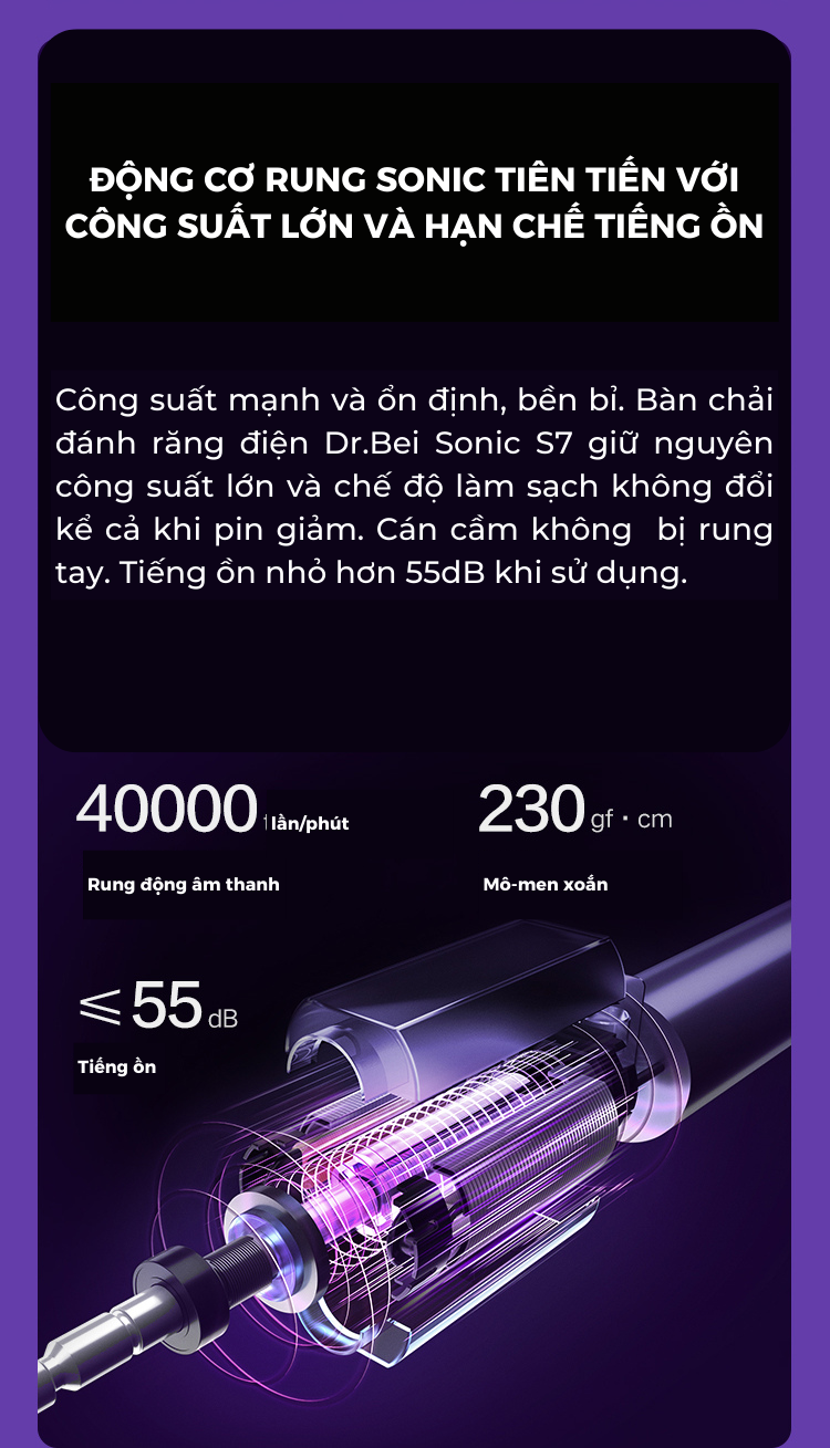 Bàn chải điện DR. BEI SONIC S7 sẽ mang đến cho bạn tất cả các dịch vụ chăm sóc răng miệng cần thiết: Có được hàm răng trắng hơn, nướu khỏe hơn và hơi thở thơm hơn.