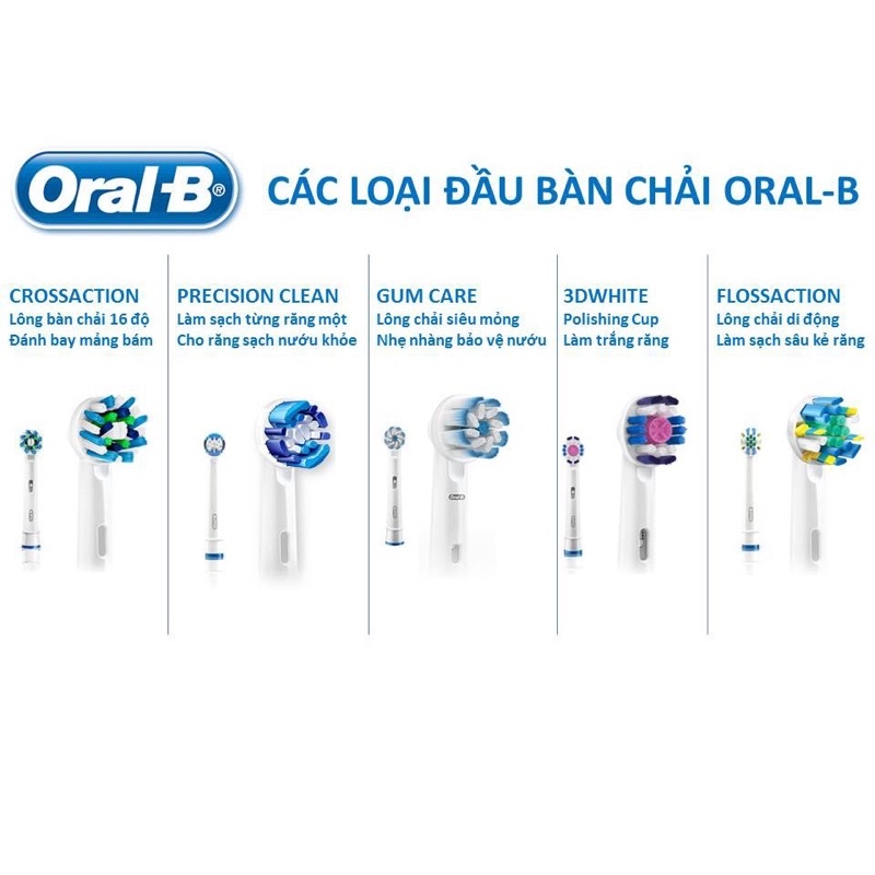 Bàn chải pin Oral-B Pro-Health Clinical tương thích và có thể thay thế dễ dàng bằng nhiều loại đầu khác nhau: - Đầu Precision Clean làm sạch từng răng một, là loại phổ thông và phù hợp với đa số người dùng nhất. - Đầu CrossAction với lông chải 16 độ giúp làm sạch sâu kẻ răng, đánh sạch mảng bám. - Đầu 3D-White với công nghệ polishing cup giúp làm trắng răng. - Đầu Gum Care lông chải mỏng nhẹ nhàng bảo vệ nướu. - Đầu Sensitive Clean chăm sóc răng và nướu nhạy cảm, là đầu có sẳn trên bàn chải Sparkle Fun dành cho trẻ em.