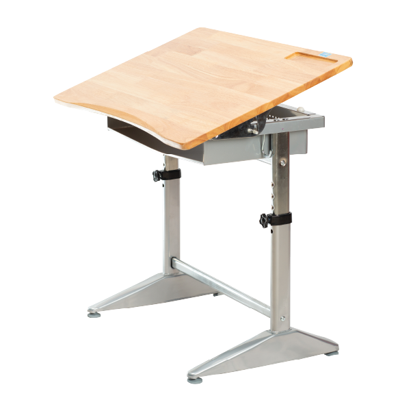 + Mặt bàn được tạo cách điệu cong cánh cung ở mặt dài phía trong, trên mặt bàn tạo phần lõm để đặt bút thước và dụng cụ học tập khác.
