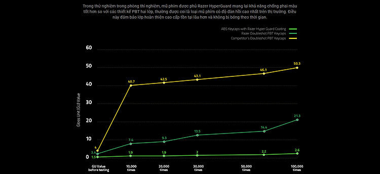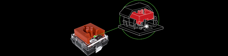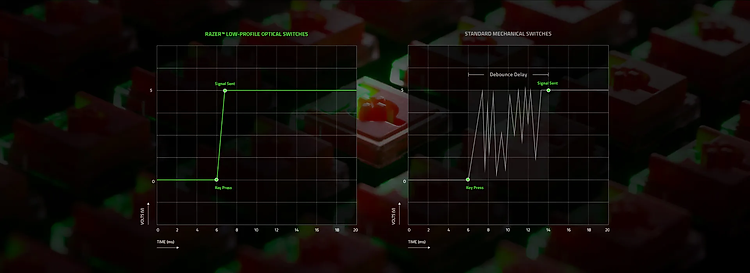 Bằng cách sử dụng ánh sáng để kích hoạt, chúng tôi loại bỏ hiện tượng nảy trong các công tắc cơ học truyền thống. Kết quả là tín hiệu sẽ được gửi ngay khi bạn nhấn phím.