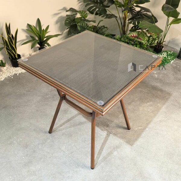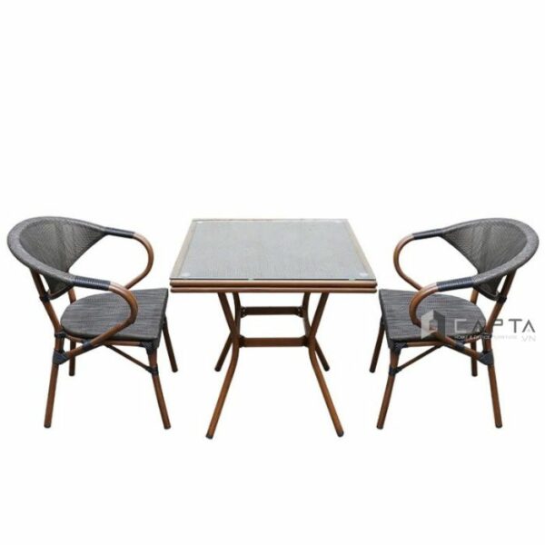 | Chất liệu | Chất liệu: Bàn: Khung nhôm, mặt bàn lưới Texilen nâu xám, có kính cường lực;Ghế: Lưng và nệm ngồi bằng lưới Teslin màu nâu/xám chân và khung ghế bằng nhôm sơn tĩnh điện, không bị gỉ sét |