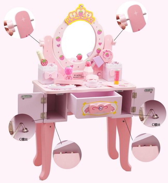 Bé yêu của bạn có thích làm đẹp giống mẹ, thích hóa thân thành một nhà trang điểm tài giỏi? Trong khi các bé thường không được phép chơi đồ trang điểm của mẹ và người thân, giờ đây bé yêu của bạn có thể thỏa sức sáng tạo và khám phá với bộ Gương trang điểm công chúa. Hãy để cho bé yêu của bạn trang điểm giống mẹ và trở thành một nhà trang điểm tài giỏi. • Sản phầm đồ chơi Nhật Bản này được thiết kế dựa trên mô hình một chiếc bàn trang điểm gồm có gương soi, hộc để đồ....., cho bé thỏa thích thể hiện trò chơi tự trang điểm của mình cùng bộ dụng cụ trang điểm. • Đặc biệt sản phẩm bao gồm tấm gương lớn, đầy đủ các vật dụng trang điểm như: máy sấy tóc, máy uốn lọn tóc, lược, con lăn, bột và son môi trang điểm hộp phấn ...... và các đồ trang sức như nhẫn, vòng đeo tay và dây chuyền (như hình). • Sản phẩm được làm hoàn toàn bằng gỗ cao cấp, tuyệt đối an toàn cho sức khỏe của bé. Mẹ sẽ an tâm cho bé thoải mái chơi đàu mà không lo sợ sản phẩm gây nguy hại cho bé. • Màu sắc trang nhã, đáng yêu. • Với này bé có thể chơi cùng bạn bè và người thân. Bé có thể tự tay chăm sóc, trang điểm cho bản thân mình, cho bố mẹ và các em. Qua đó phát huy khả năng sáng tạo, trí tưởng tượng của bé và bé thêm yêu gia đình hơn.