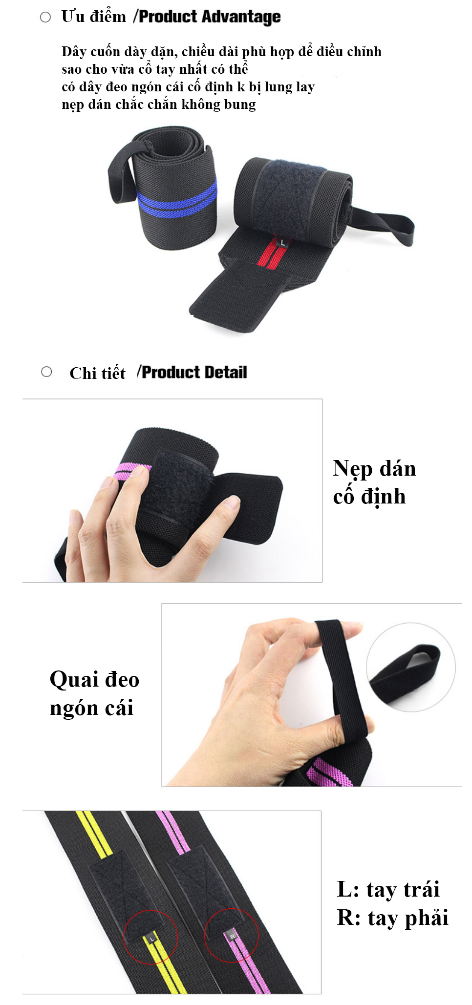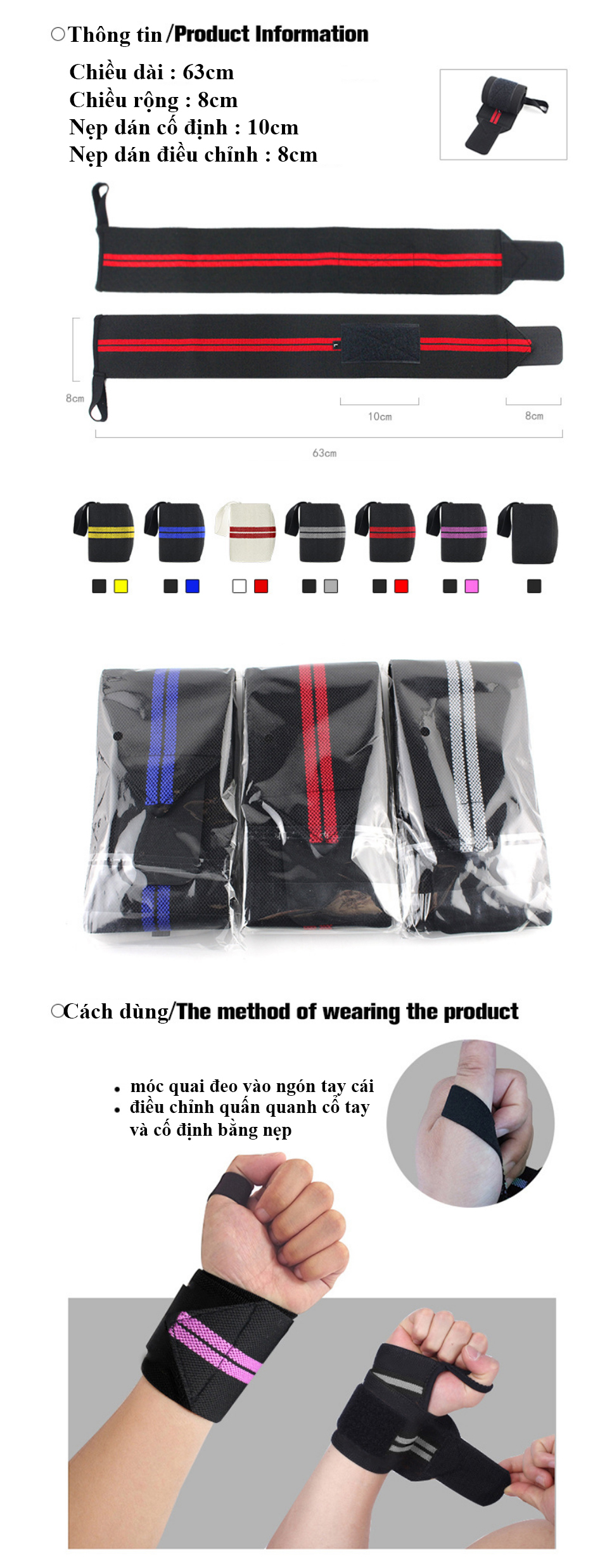 - Thiết kế băng quấn tay thông minh với lỗ nhỏ ôm lấy ngón tay cái, thuận tiện cầm nắm, lên tạ. Sản phẩm giúp bảo vệ cổ tay, tránh chấn thương khi tập gym, hạn chế bong gân, tổn thương khớp tay