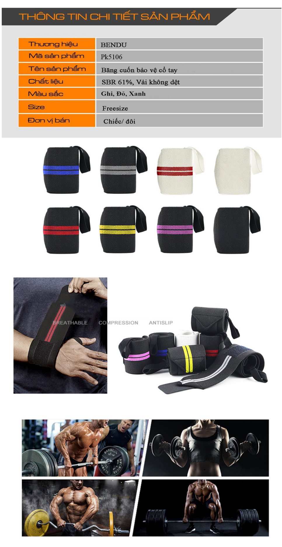 Băng cuốn bảo vệ cổ tay Bendu PK5106 là phụ kiện không thể thiếu của các Gymer với các bài tập thể thao: nâng tạ, chống đẩy, tập thể lực với dụng cụ,… giúp bảo vệ cổ tay chắc chắn, tránh xảy ra chấn thương, bong gân và tổn thương đến vùng cổ tay.