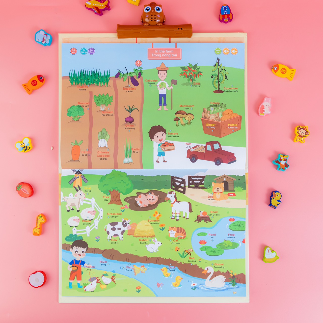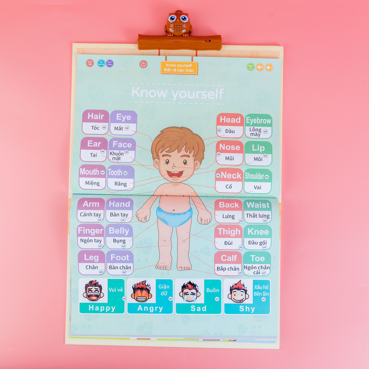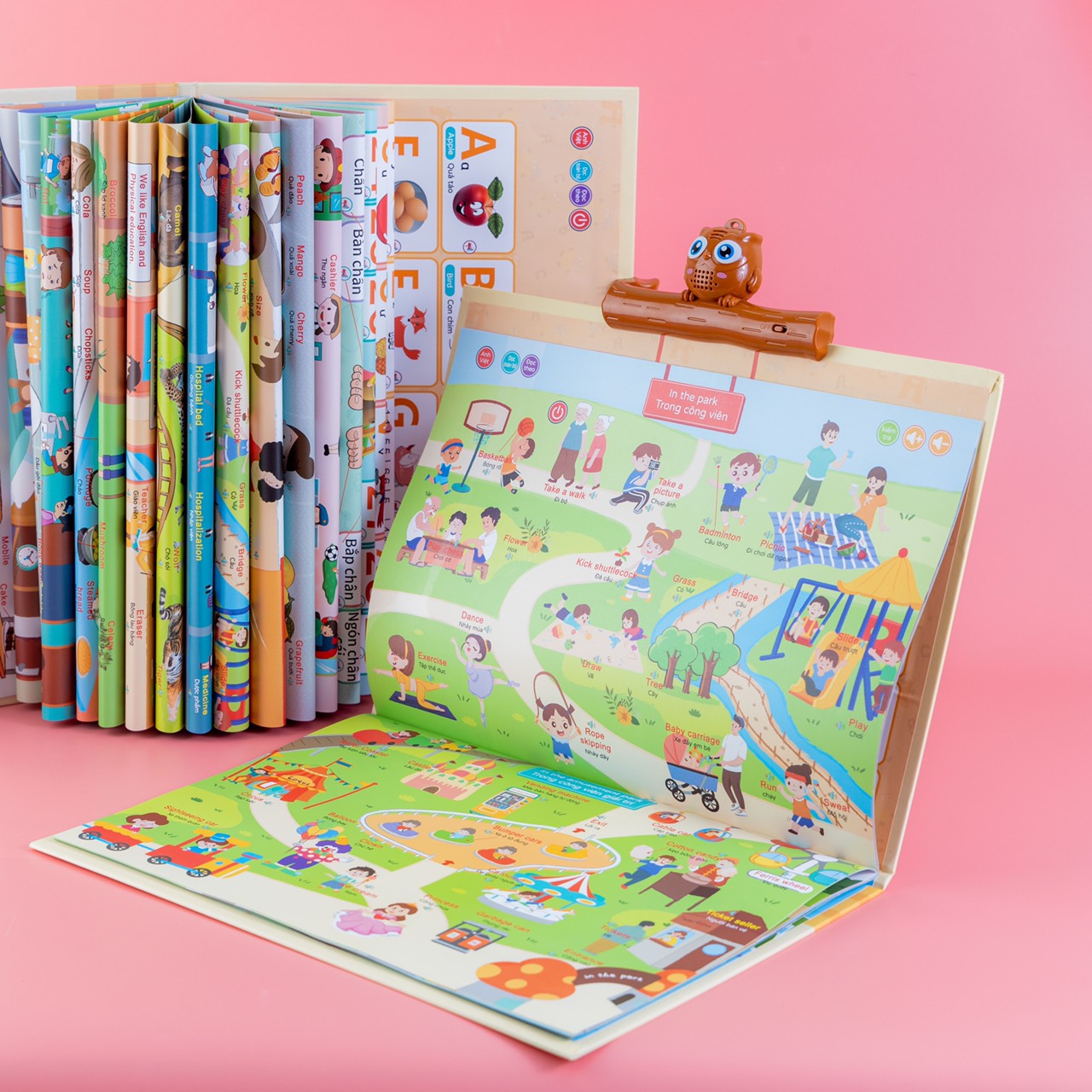 Cuốn từ điển khổ to A3 ( 51 trang ) gồm hơn #900 nút âm thanh. Từ vựng song ngữ Anh Việt kèm hình ảnh minh hoạ + âm thanh được sắp xếp thành 39 chủ đề quen thuộc với trẻ như nhóm chủ đề: Trong nông trại, trong công viên, trong sở thú, bảng chữ cái tiếng Anh, bảng chữ cái Tiếng Việt, bảng số, bộ phận cơ thể, nghề nghiệp, thế giới đại dương, trường học, địa điểm, tên gọi, đồ vật trong phòng tắm, phòng khách, phòng ngủ, bếp, thời tiết, thời gian, hình dạng màu sắc, cảm xúc, phương tiện giao thông, thể thao, thói quen tốt, bài hát thiếu Khối lượng lớn kiến thức và từ vựng song ngữ được tổng hợp trong cuốn sách âm thanh Hopkids.