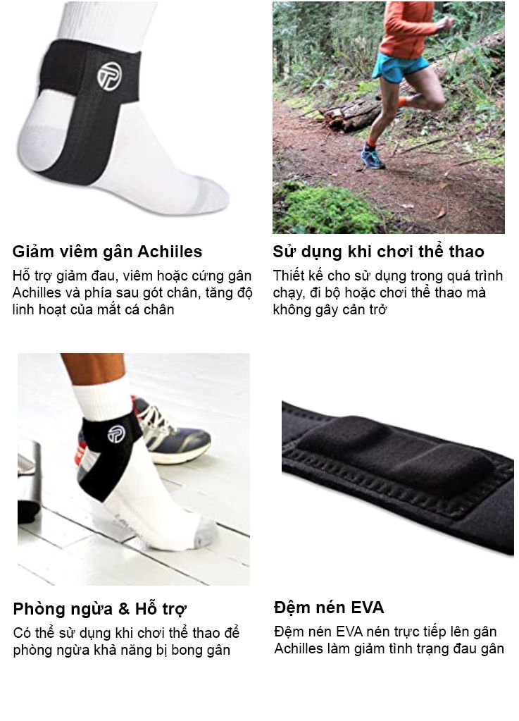 Sản phẩm hỗ trợ gân gót chân ACHILLES TENDON SUPPORTS hỗ trợ vận động viên gặp các vấn đề với gân gót chân ( gân Achilles). Trợ lực cho gân gót , hỗ trợ hồi phục các chấn thương gân gót chân. Trang bị đệm EVA bao quanh gân Achilles mang lại sự ổn định và thoải mái