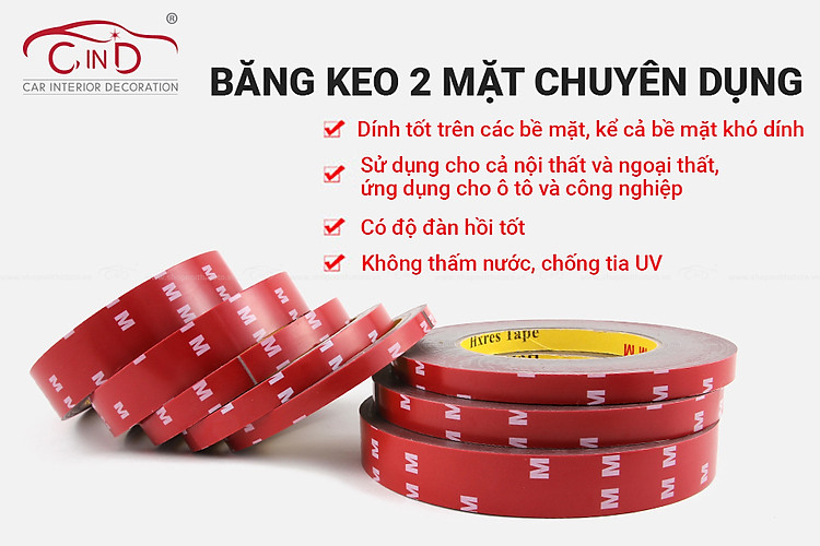 Băng keo 2 mặt chuyên dụng CIND (10mmx10m) sử dụng hữu hiệu cho xe hơi và trong nhà có tác dụng cố định các đồ vật hoặc liên kết các bề mặt với sự kết dính cao, hỗ trợ việc thay thế các mối hàn cũ mà không để lại các dấu vết hư hỏng trên bề mặt sử dụng.