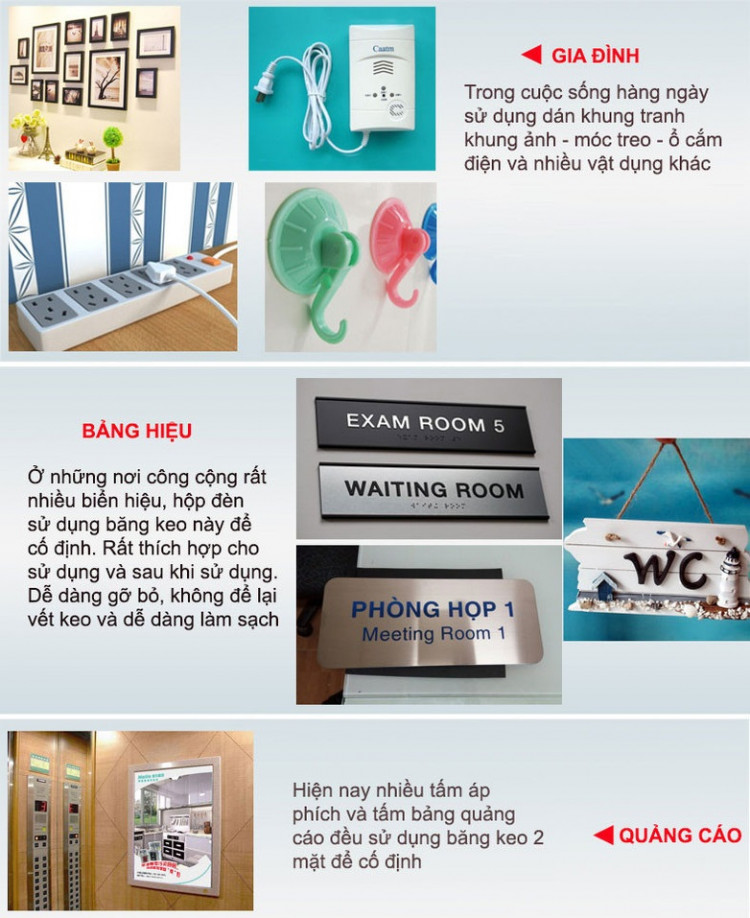 Ngoài ra, Băng keo cường lực siêu mỏng 3M khổ 8mm x 33m VHB 5915-08 còn ứng dụng trong đồ dùng gia đình như dùng dán các vật dụng trang trí mang tính thẩm mỹ cao...; dán cố định khung tranh lên bàn gỗ, tường gỗ; dán biển số nhà hay các ký tự cho biển quảng cáo...