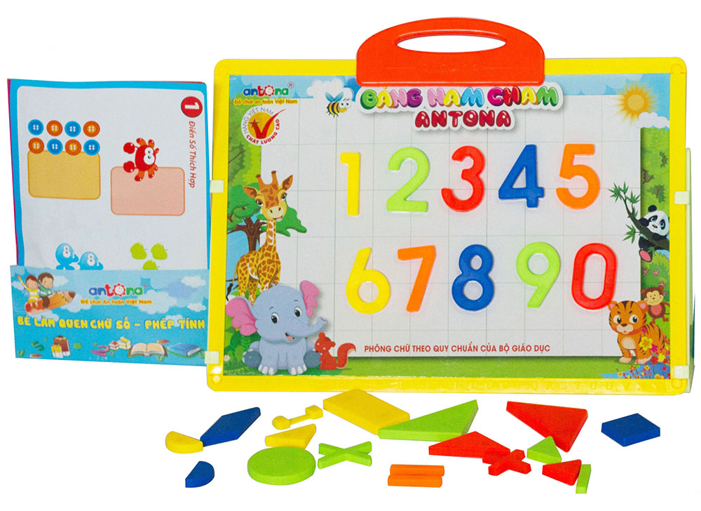 Sản phẩm là một bảng từ nam châm với 10 chữ số, 5 dấu phép tính, 12 miếng ghép trí uẩn, 2 chân đứng và 1 quyển sách với 3 cấp độ khác nhau từ dễ đến khó để bé làm quen và học tập một cách dễ dàng. Bé sẽ bắt đầu học và chơi bằng việc xếp các chữ số, thanh dấu và tập làm phép tính trên bảng nam châm. Với 1 quyển sách hướng dẫn có 3 cấp độ khác nhau từ dễ đến khó, bé có thể vừa học vừa chơi, tiếp thu tất cả những kiến thức và kỹ năng cơ bản cần thiết nhất trước khi tới trường.