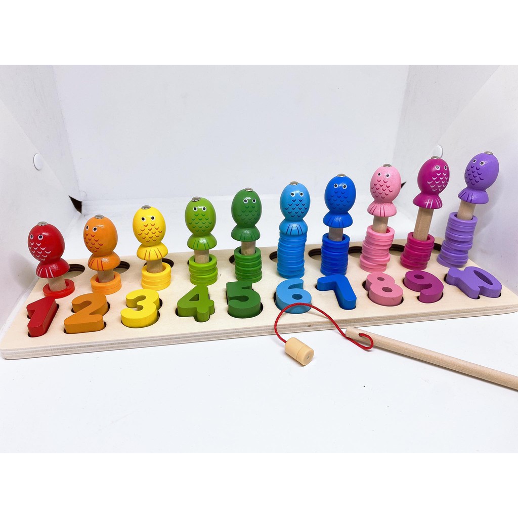 ➖ Bộ ghép số bằng gỗ đẹp nhất mà mẹ từng thấy nè Kết hợp đủ các trò chơi bé thích : ghép số, xếp vòng tương ứng các số, câu cá, ghép hình khối, học đếm, phân biệt màu sắc Kích thước bảng: 42 x 15 x 16 cm