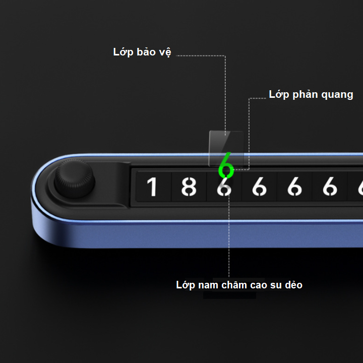 - Để gắn bảng số điên thoai trên taplo cần đến một miếng dán keo cố định 3M để dính. Từng chữ số trên bảng ghi số điên thoai có cấu tạo 3 lớp: Lớp nam châm cao su dẻo, lớp sơn màu trắng phản quang, lớp phủ bóng chống phai màu.