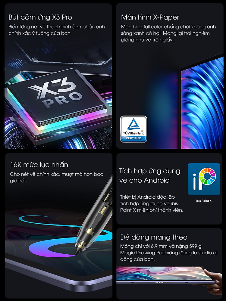 Xp-pen Magic Drawing Pad sở hữu bút cảm ứng X3 Pro là một công cụ sáng tạo mạnh mẽ dành cho các nghệ sĩ và người yêu thích vẽ kỹ thuật số. Với 16K mức lực nhấn, giúp tái hiện chính xác từng nét vẽ, mang lại cảm giác như vẽ trên giấy thật. Màn hình X- Paper với độ phân giải cao tạo ra hình ảnh sắc nét và tự nhiên, đồng thời giảm thiểu hiện tượng phản chiếu ánh sáng, giúp người dùng trải nghiệm thoải mái trong mọi điều kiện ánh sáng. Đây là lựa chọn lý tưởng cho những ai tìm kiếm sự kết hợp hoàn hảo giữa độ chính xác và cảm giác tự nhiên khi sáng tạo.