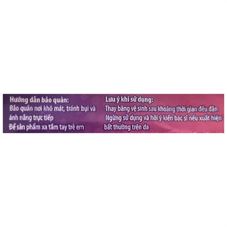 •Đặc điểm nổi bật - Chiều dài 35 cm, thiết kế cánh sau mở rộng đến 16cm vừa vặn với cơ thể, chống tràn sau tối đa. - Công nghệ lõi thấm hút Double High Speed giúp thấm hút siêu nhanh và khóa chất lỏng tức thì. - Vách chống tràn co giãn Active Standing Gather, ôm khít cơ thể, ngăn tràn sang 2 bên. - Bề mặt lưới lụa hóa mềm mại, mang lại cảm giác thoải mái cho bạn giấc ngủ ngon giấc. •Hướng dẫn sử dụng - Bóc miếng giấy không dính và dán băng vào đáy quần lót. - Sau khi sử dụng cuộn băng vào bao và bỏ vào sọt rác. - Nên thay băng 3 – 4 giờ/lần để ngăn ngừa vi khuẩn gây bệnh.
