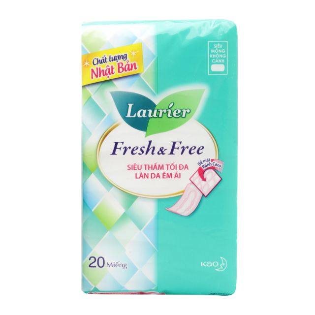 Băng vệ sinh siêu mỏng không cánh ban ngày Fresh & Free Lauríer là sản phẩm băng vệ sinhdùng cho ngày vừa và ngày nhiều với cấu trúc bề mặt dạng rãnh caro có khả năng hút hoàn toàn chất lỏng từ mọi hướng. Laurier Fresh & Free thấm nhanh gấp 2 lần, tạo cảm giác khô thoáng gấp 5 lần nhờ công nghệ Quick Lock từ Nhật bản. Công nghệ này tăng cường khả năng khóa chặt chất lỏng và ngăn thấm ngược trở lại bằng tác động của các hạt siêu thấm thần kỳ, đảm bảo không tràn băng ngay cả trong những ngày nhiều. Nhờ đó, bạn gái luôn được khô thoáng, thoải mái trong nhiều giờ. Bề mặt mềm mại và êm dịu, nâng niu vùng da nhạy cảm của bạn. Miếng băng siêu mỏng giúp bạn thoải mái vận động suốt ngày dài.