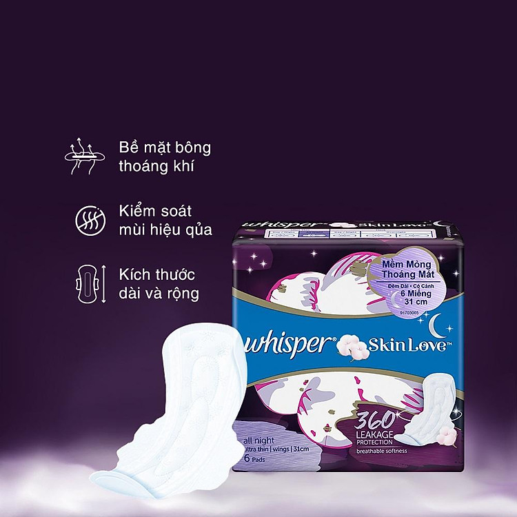 Băng Vệ Sinh Whisper Skinlove All Night Ultra Slim Wings 360 Leakage Protection Ban Đêm 31cm 6 Miếng